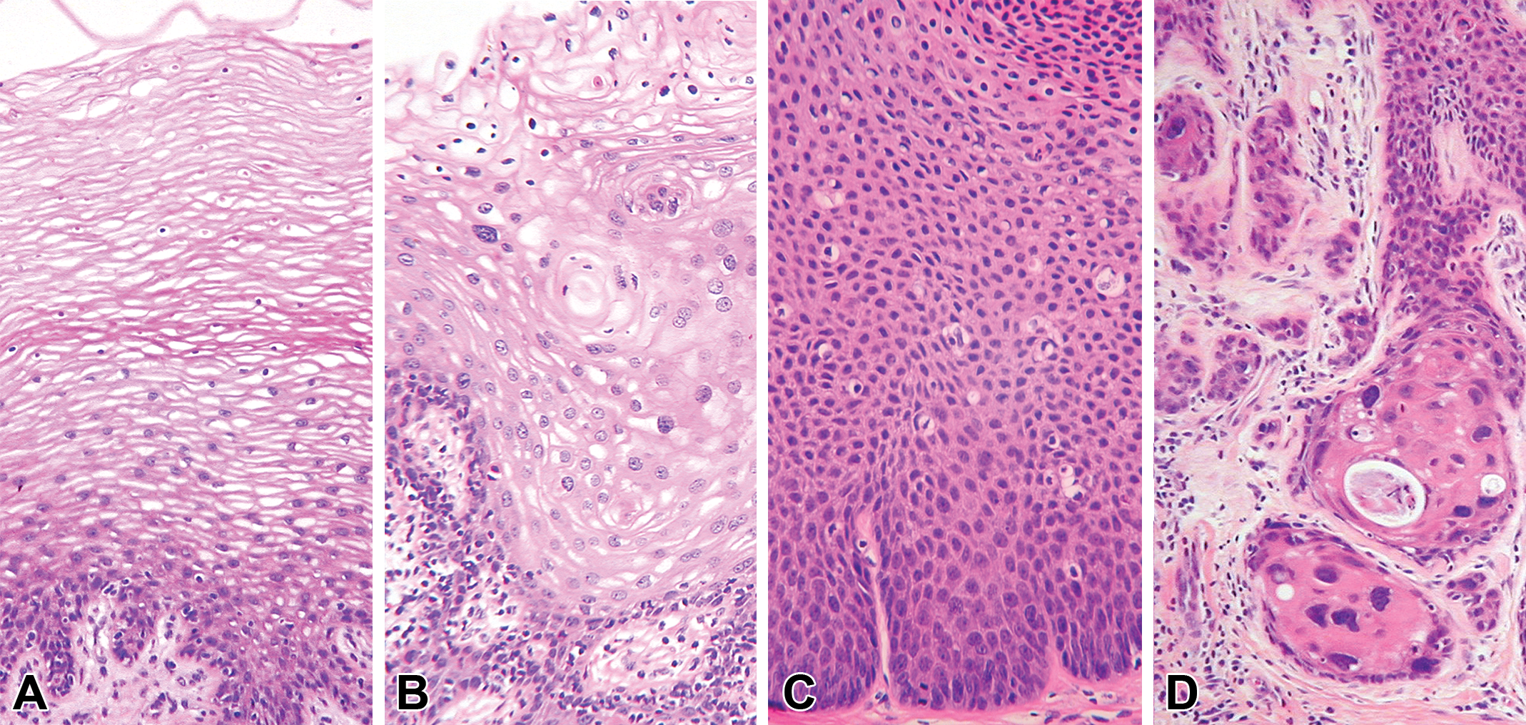Papillomavirus-induced lesions of the vagina and cervix in cynomolgus monkeys. A, Normal, (B) epithelial atypia, (C) basal hyperplasia, and (D) atypia bordering on squamous cell carcinoma.