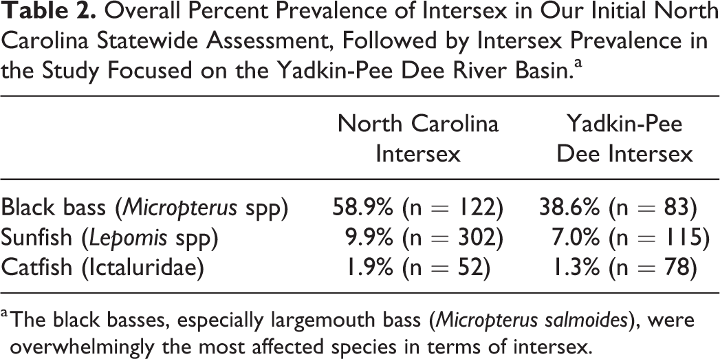 Table 2 shows the overall percent prevalence of intersex in our initial, statewide assessment, followed by the intersex prevalence in the study focused on the Yadkin-Pee Dee River basin. The black basses, especially largemouth bass (