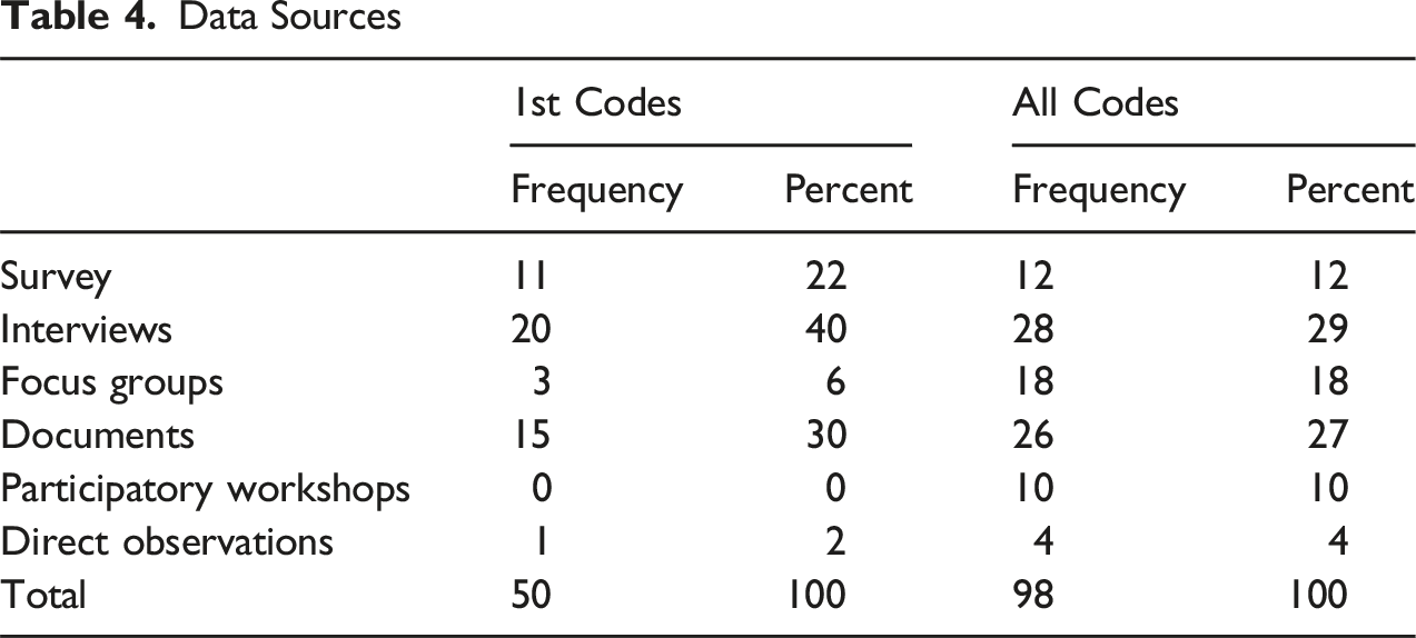 Documents, broadly defined, are the second most important category, but even here there is considerable heterogeneity. Often “documents” refers to official documents (such as policies, laws, regulations), but the category also includes field notes, protocols, and other types of written records produced during the evaluation. Some categories were less common than we expected. For example, direct observations are rare. Sometimes we also found it difficult to distinguish between different categories – for instance, focus groups and participatory workshops were sometimes indistinguishable.