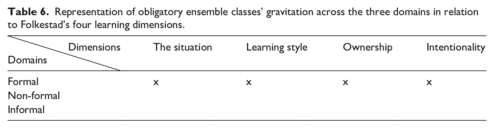In the following section, I will explore how Folkestad’s (2006) learning dimensions and Green’s (2008) characterization of informal learning can be applied in combination with Coombs and Ahmed’s (1974) domains of formal, informal, and non-formal education to examine the six identified ensemble contexts. Tables 1 to 6 depict how these contexts can be understood as gravitating toward UNESCO’s three domains (Coombs & Ahmed, 1974), in Folkestad’s (2006) learning dimensions: the situation, learning style, ownership, and intentionality. It is important to note that the placement of the six contexts within this framework is a suggestive interpretation of the situations. These empirical examples will serve as reference points when Folkestad’s learning dimensions are further elaborated in the subsequent section.