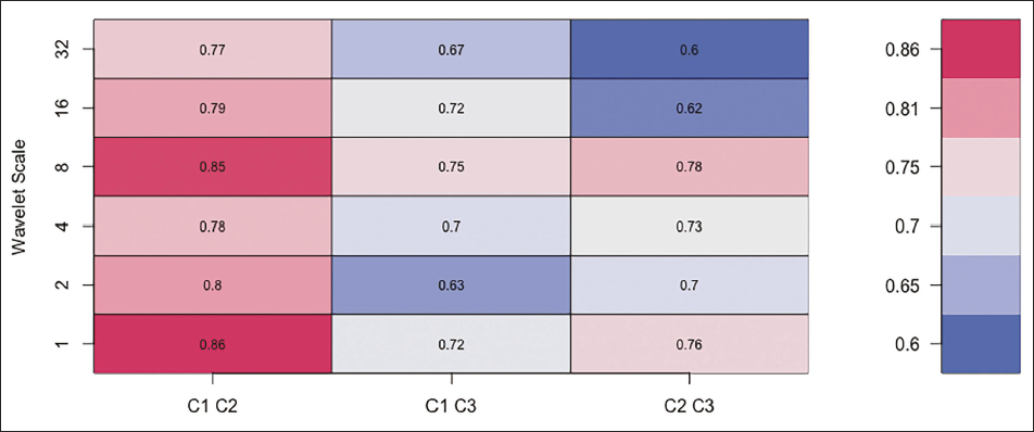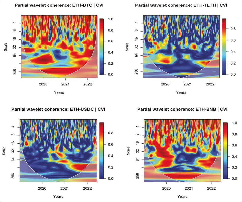 Following the initial depiction of the presence of cointegration between these cryptocurrencies and CVI, it is worthwhile to investigate their multi-scale and time-frequency interlinkages using wavelet analysis. The study covers various time scales, encompassing the intraweek scale, weekly scale, fortnightly scale, monthly scale, monthly to quarterly scale, quarterly to biannual scale and biannual to annual scale. Bivariate wavelet coherence, partial wavelet coherence and multiple wavelet correlations are estimated to depict co-movements, causal relationships, the impact of CVI on interlinkages and the degree of interlinkages among cryptocurrencies and CVI across different investment horizons.