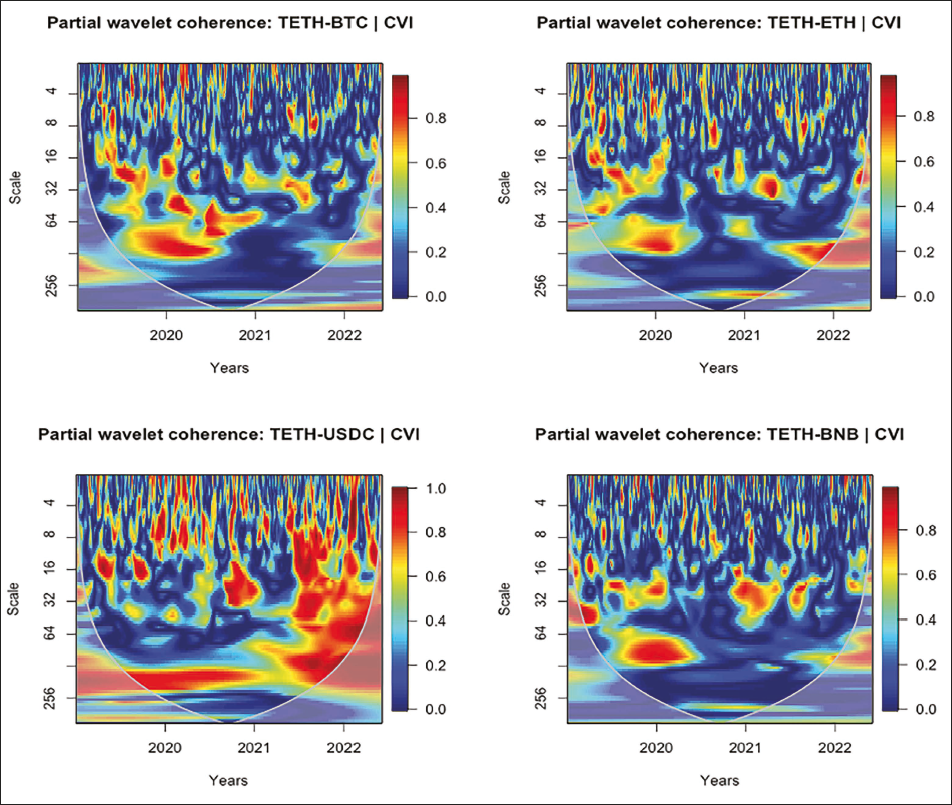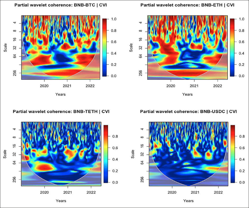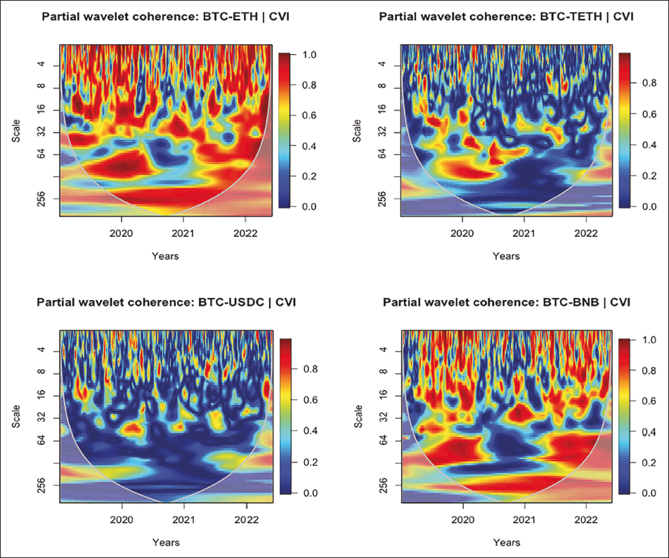 Bivariate wavelet coherence, partial wavelet coherence and multiple wavelet correlations are estimated to depict co-movements, causal relationships, the impact of CVI on interlinkages, and the degree of interlinkages among cryptocurrencies and CVI across investment horizons. The time-frequency analysis of interlinkages using wavelet coherence comprehends the time frequencies of co-movements between the series. It can be inferred from their estimates that the CVI exhibits significant short-term, medium-term and long-term interlinkages with Bitcoin, Ethereum, Tether, USD-Coin and BNB. The time-frequency analysis using partial wavelet coherence depicts that CVI does not drive the perseverance of high correlations between cryptocurrencies. Specifically, there is no change in the degree of interlinkages between Bitcoin and other cryptocurrencies, Ethereum and other cryptocurrencies, Tether and other cryptocurrencies, USD-Coin and other cryptocurrencies, or BNB and other cryptocurrencies when CVI is included as a covariate. These results depict the prevalence of idiosyncratic shocks over the common interlinkages within individual cryptocurrency markets. As a result, CVI may not generally serve as a hedging proxy for these cryptocurrencies when included in the same portfolio. The estimates of wavelet bivariate correlations highlight that Bitcoin and Ethereum exhibit the highest degrees of co-movements across various time scales, followed by Bitcoin and BNB, and Ethereum and BNB. The co-movements in these pairs are positive from intraweek scales to quarterly scales, representing short-term and medium-term real economic transactions. These positive movements make diversification impracticable between these pairs, as they tend to exhibit behaviour associated with speculative bubbles. The estimates from multiple wavelet correlations confirm that the degree of interlinkages is relatively high in the long term, with undulations or surges over the time horizon. This accentuates a higher convergence of cryptocurrencies’ returns in the long term, even in the presence of CVI. The wavelet multiple cross-correlations coefficients depict Ethereum as the most influential variable in the short term, Bitcoin as the most influential variable in the short to medium term, CVI as the most influential variable in the monthly to quarterly scale (i.e., in the medium term). The estimates also confirm that Ethereum leads or lags at the intraweek and weekly scales, Bitcoin leads at the fortnightly and monthly scales, and CVI lags at the monthly to quarterly scale.