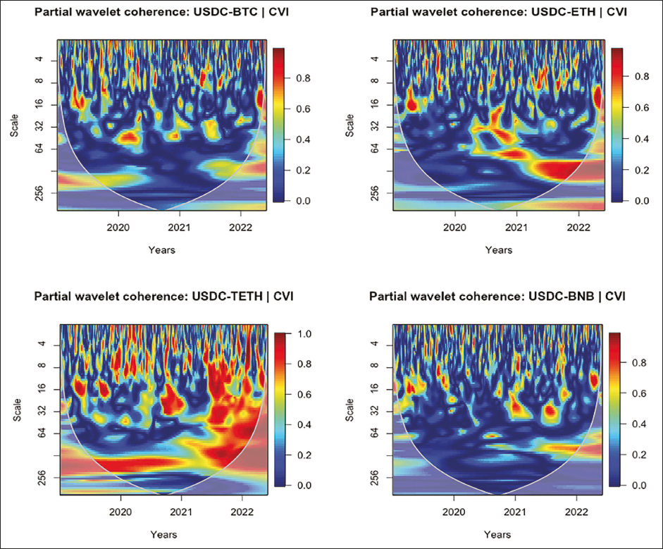 The impact of CVI on the co-movements between cryptocurrencies, as shown through partial wavelet coherence in Figures 9–13, reveals that CVI does not drive the perseverance of high correlations between cryptocurrencies. From these plots, it can be observed that the inclusion of CVI as a covariate does not change the degree of interlinkages between Bitcoin and other cryptocurrencies, Ethereum and other cryptocurrencies, Tether and other cryptocurrencies, USD-Coin and other cryptocurrencies or BNB and other cryptocurrencies. This implies that the CVI does not significantly influence the relations between cryptocurrency pairs. Moreover, it indicates the prevalence of idiosyncratic shocks over the common interlinkage within individual cryptocurrency markets during the sample period. Consequently, CVI may not generally serve as a hedging proxy for these cryptocurrencies in case they are included in the same portfolio.