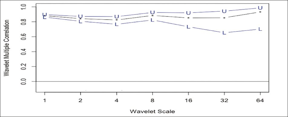 The multiple wavelet correlations are estimated to reveal the degree of cointegration, while the multiple wavelet cross-correlations are estimated to uncover the lead–lag relation among Bitcoin, Ethereum, Tether, USD-Coin, BNB and CVI, across different investment horizons. These statistics provide better insights by measuring the overall interactions at various time scales. Figure 15 and Table 5 display the wavelet multiple correlations among these cryptocurrencies and CVI, with frequency localization using maximal overlap discrete wavelet transform to capture the interlinkages across short-term, medium-term and long-term horizons. The degree of interlinkages is relatively higher in the long term, with undulations or surges in WMC over the time horizon. The value of WMC averages around 0.9317859, with an upper bound of 0.9858467 and a lower bound of 0.7021977 in the long term. This accentuates the higher convergence of cryptocurrencies’ returns in the long term, even in the presence of CVI.