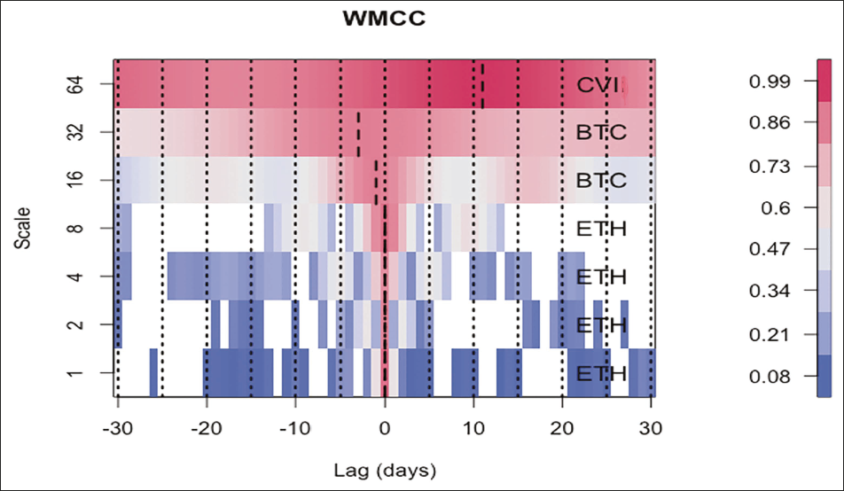 Figure 16 displays the wavelet multiple cross-correlations coefficients, with the horizontal axis portraying positive and negative lag length of 30 days and the vertical axis portraying wavelet scales. Note that localizations at negative lags represent the leading variable, while those at positive lags represent the lagging variable. A localization at zero lag represents the absence of both lead and lag relationships. In this analysis, localization means the peak values in the linear combination of Bitcoin, Ethereum, Tether, USD-Coin, BNB and CVI at their respective wavelet scales. The localization in Figure 16 is portrayed by short-dashed lines within dotted lines at the corresponding lag intervals. The variable listed on scale indicates the variable that has the potential to either lead or lag all other variables. From the plot, it can be observed that Ethereum is the most influential variable for maximizing the WMCC in the short term, Bitcoin is the most influential variable for maximizing the WMCC in the short to medium term, and CVI is the most influential variable for maximizing the WMCC in the monthly to quarterly scale, that is, in the medium term. The plot also reveals that Ethereum leads or lags at the intraweek and weekly scales, Bitcoin leads at the fortnightly and monthly scales, and CVI lags at the monthly to quarterly scale.