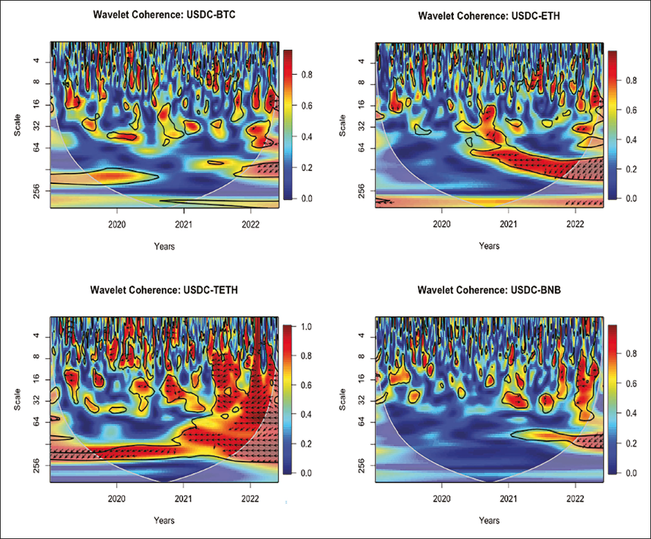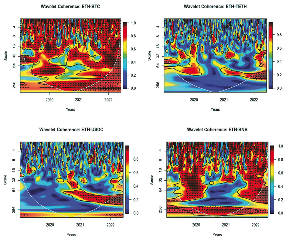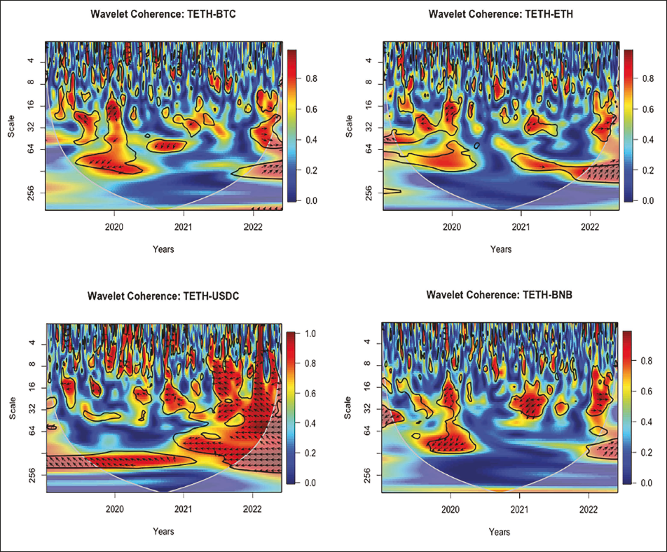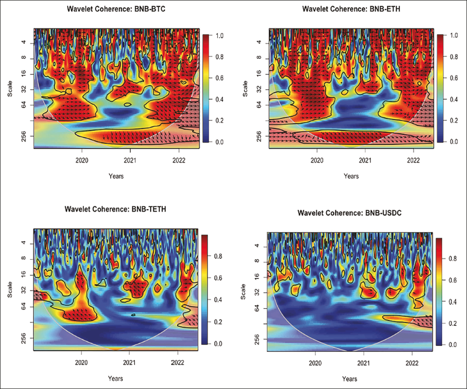 The descriptive discernment of the price and return series of Bitcoin, Ethereum, Tether, USD-Coin, BNB and CVI in this treatise reveals varying trends over time, indicating possibilities for these cryptocurrencies to respond differently to market conditions and resulting in varying co-movements at different time scales. Additionally, the variations in average returns and risk, as evidenced by skewness and kurtosis values, indicate differing risk–return profiles among these cryptocurrencies. These differences in risk and return characteristics may result in varying co-movements across different time scales. Furthermore, the clustering of volatility in the return series of these cryptocurrencies influences their co-movements at different time scales, with periods of high volatility potentially strengthening correlations among these cryptocurrencies. In a nutshell, the diverse trends, risk–return profiles and volatility patterns suggest that the co-movement of cryptocurrencies may vary over different time scales due to unique market dynamics, justifying the expectation of differing co-movements between cryptocurrencies across short and long terms.