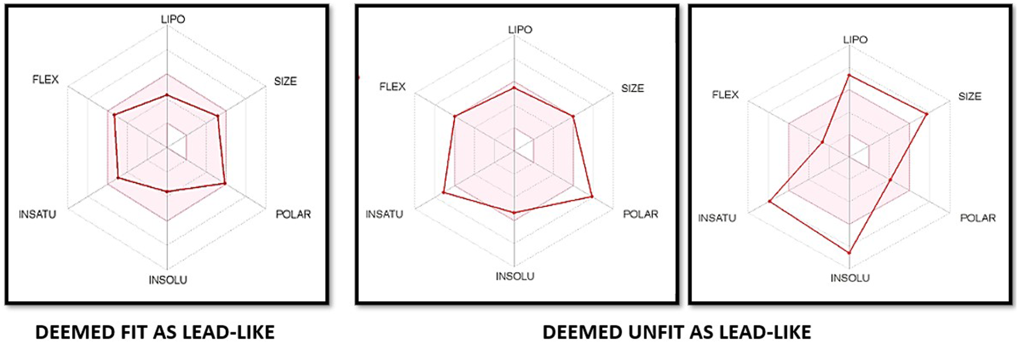 To identify the molecules most likely to be safe and druggable, each of the initial 100 molecules was subjected to an evaluation of its pharmacokinetic and drug-like properties, including the bioavailability profile, Log P value, ability to breach the BBB, GI absorption and ability of P-gp to eliminate the substance from the cranial environment. Of these 100 molecules, 30 were found to have physicochemical properties falling within the pink area of the bioavailability radar in Figure 1 — i.e. within a suitable physicochemical space for oral bioavailability. The pink area represents the optimal range for each property, namely: — lipophilicity (LIPO): a XLOGP3 value of between −0.7 and +5.0; — size (SIZE): a molecular weight (MW) of between 150 and 500 g/mol; — polarity (POLAR): a total polar surface area (TPSA) of between 20 and 130 Å2; — solubility (INSOLU): a log S value not higher than 6; — saturation (INSATU): the fraction of sp3 hybridised carbons not less than 0.25; and — flexibility (FLEX): no more than 9 rotatable bonds.
