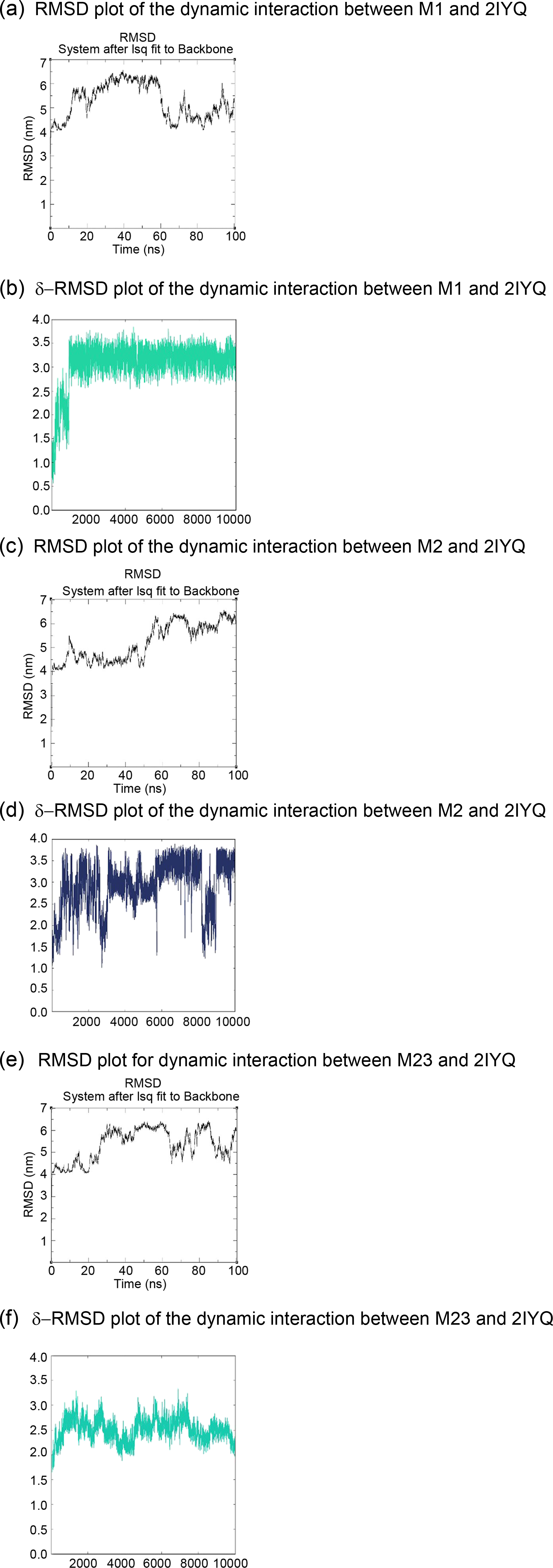 The complex between M23 and 2IYQ (Figure 2e and f) was reportedly more stable than that formed with M1 and M2, as evidenced by the lower drift in δ-RMSD values. Despite some drifts observed in the δ-RMSD values, the complexes formed remained stable enough to ensure that the crystalline structure of the enzyme would not denature, as the degree of gyration was maintained for all of the structures.