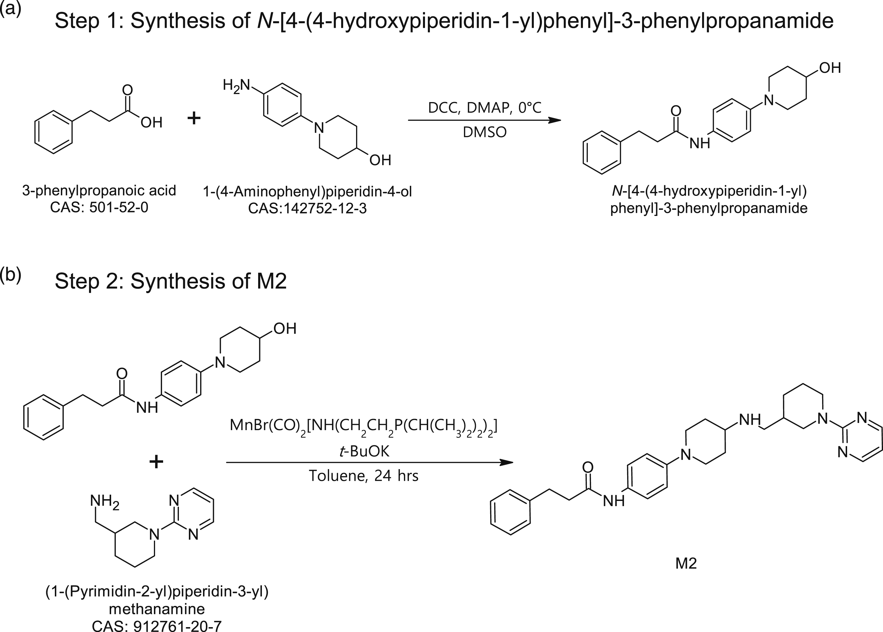 The retrosynthesis pathway prediction for M2 was carried out based on a literature survey of known chemical reactions, and the proposed synthetic scheme obtained from the literature review is shown in Figure 4. Step 1 (Figure 4a) is the condensation of 3-pheylpropanoic acid with 1-(4-aminophenyl)piperidin-4-ol by using Retrosynthesis pathway prediction for M2.
