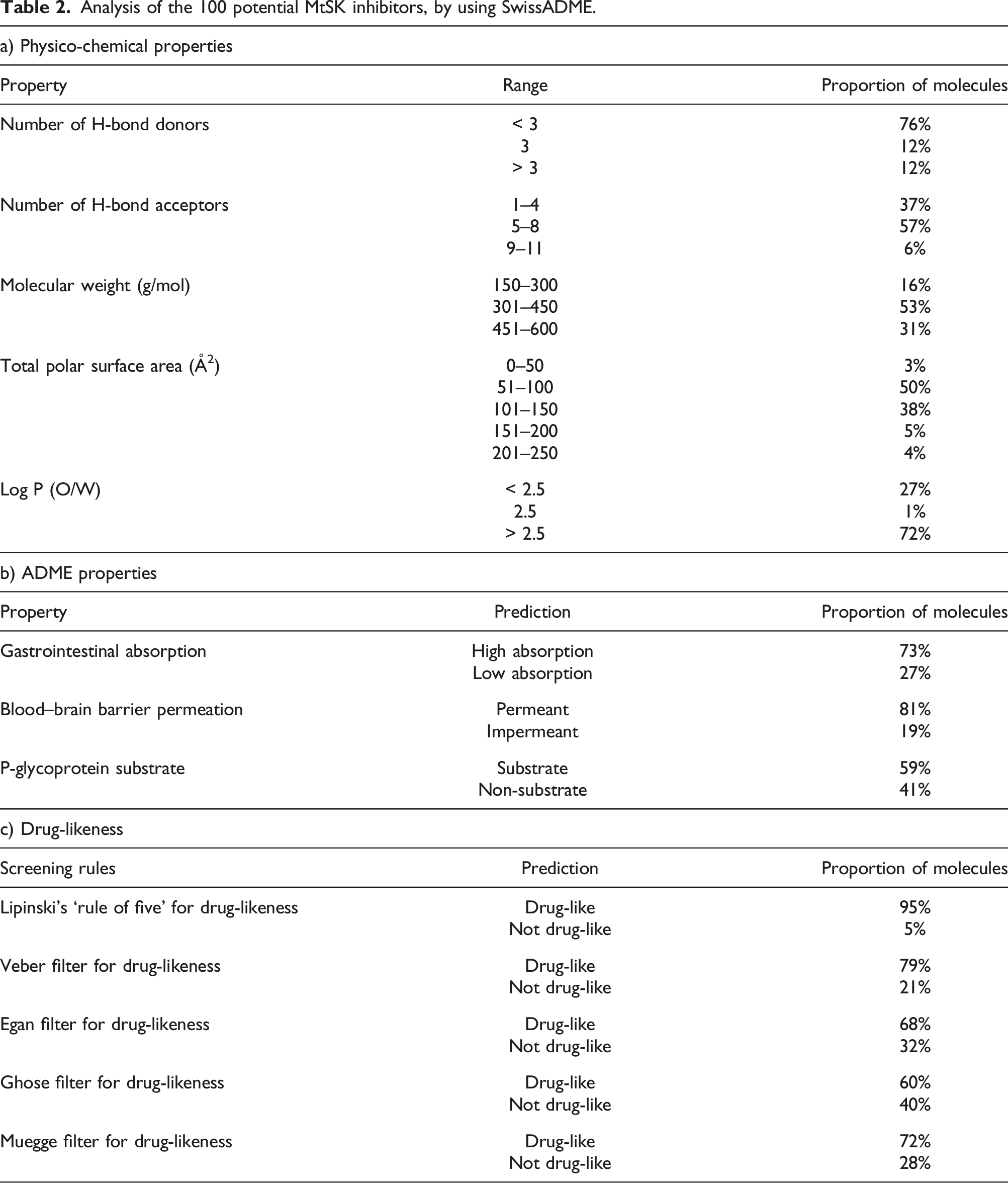 Lipinski’s ‘rule of five’ showed that 95% of the analysed compounds were drug-like. The Veber filter indicated that 79% of the compounds had drug-like structural attributes, while the Egan filter showed 68% of compounds to be drug-like (Table 2c). The Ghose and Muegge filters indicated that 60% and 72% of the molecules, respectively, were drug-like.