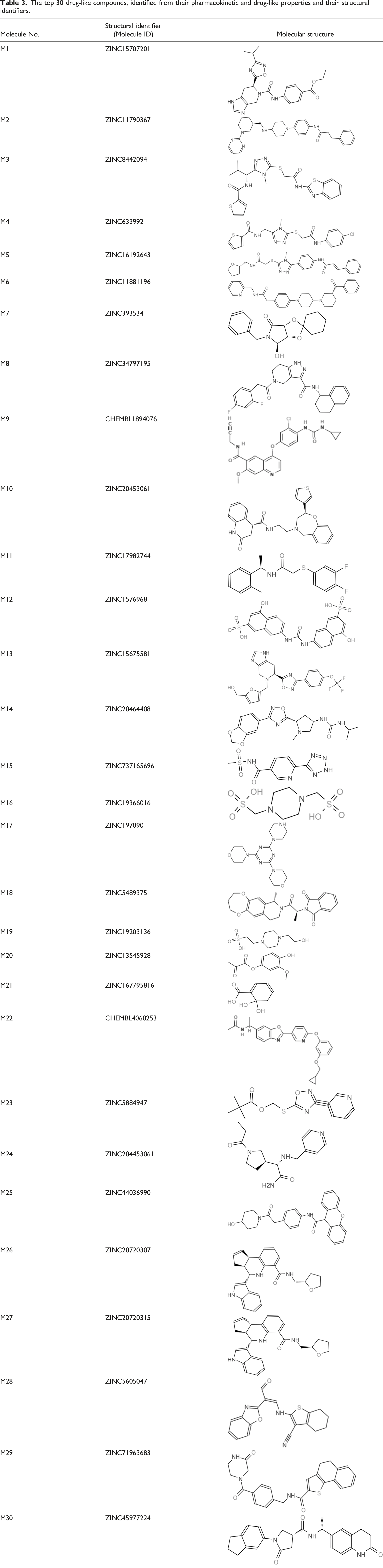 The top 30 drug-like compounds, identified from their pharmacokinetic and drug-like properties and their structural identifiers.