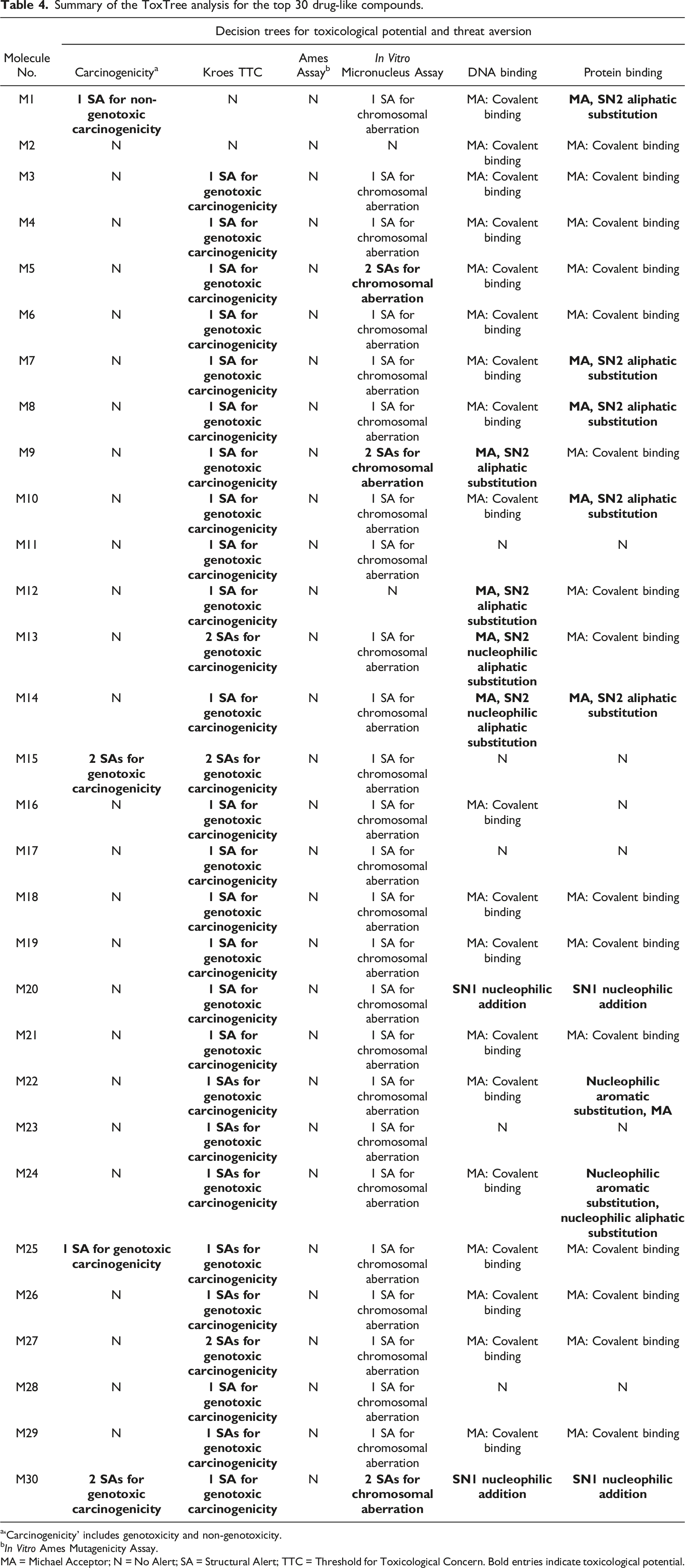 MA = Michael Acceptor; N = No Alert; SA = Structural Alert; TTC = Threshold for Toxicological Concern. Bold entries indicate toxicological potential.
