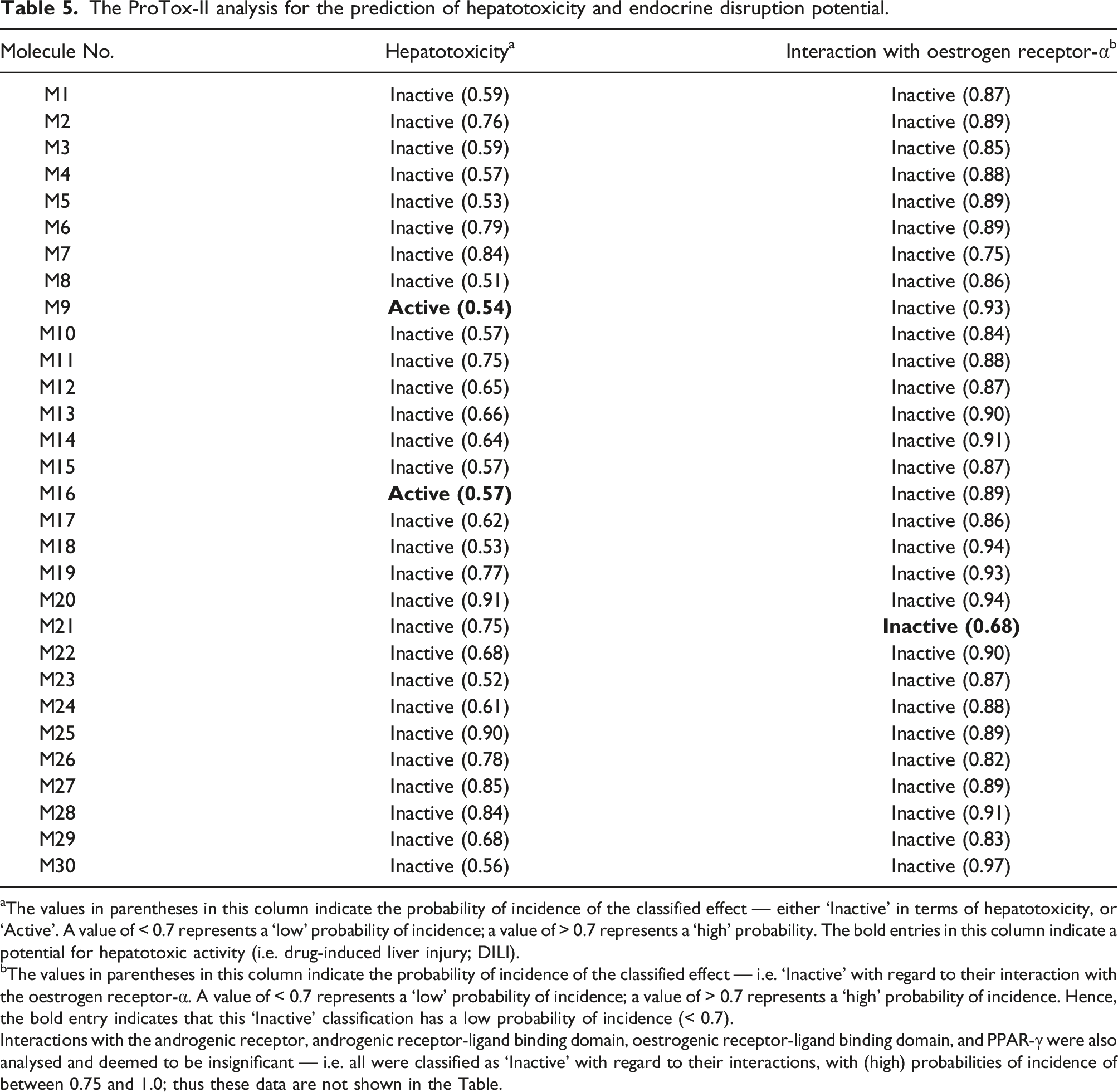 The same tool, ProTox-II, was also used to predict the potential for hepatotoxicity (i.e. drug-induced liver injury; DILI). Two molecules (M9 and M16) were highlighted by ProTox-II as having the potential to cause DILI, albeit at a low probability of incidence (< 0.7); these are indicated in bold in Table 5. The remaining 28 molecules were classified as ‘Inactive’ with regard to their potential hepatotoxic activity — 17 with a high probability of incidence (> 0.7) and 11 with a low probability (< 0.7).