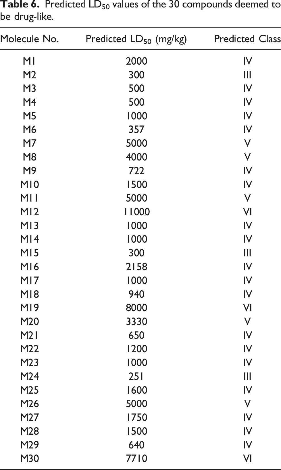 Predicted LD50 values of the 30 compounds deemed to be drug-like.