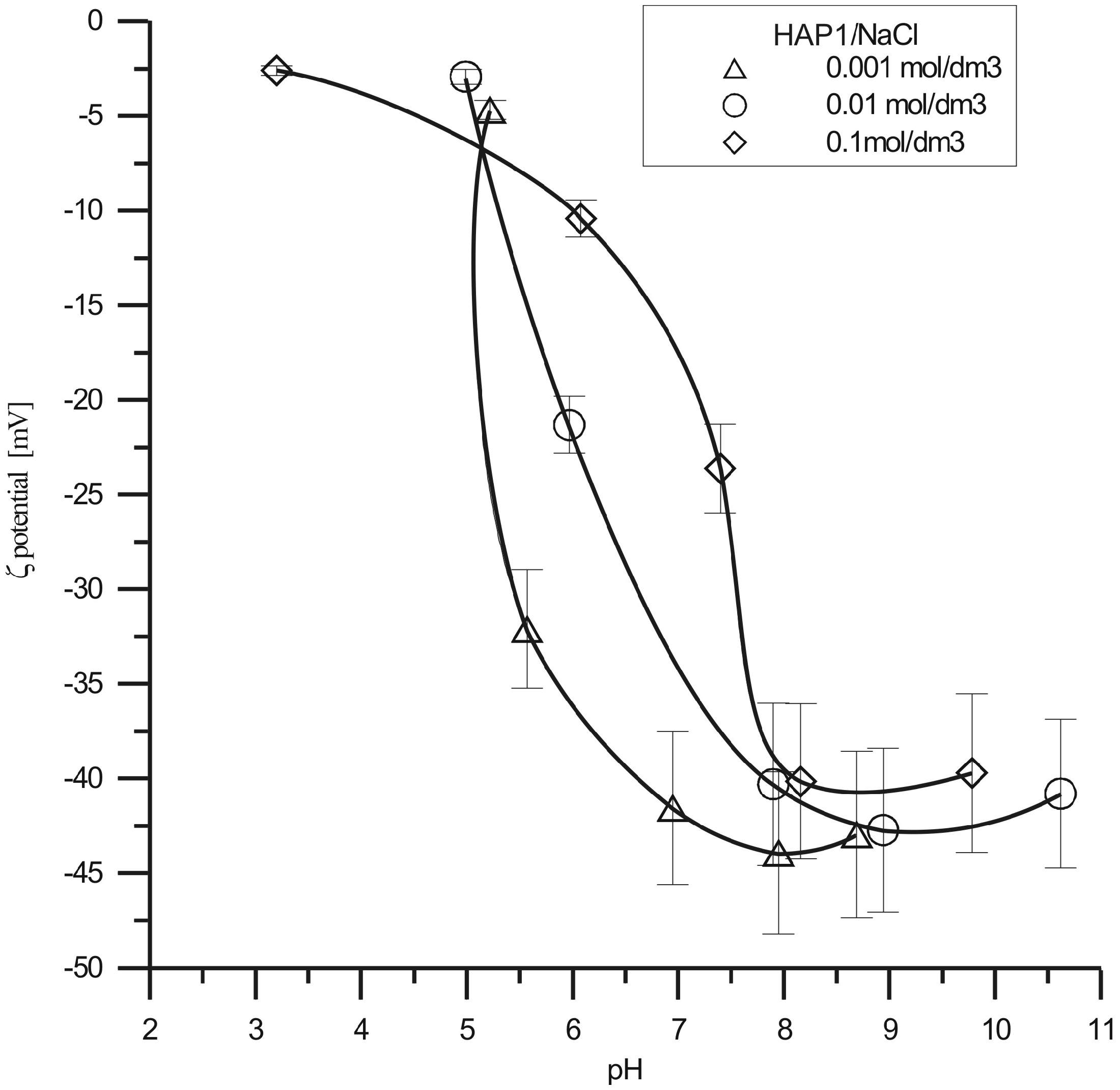 Zeta potential of the HAP1/NaCl solution interface as a function of pH. Zeta potential of the HAP2/NaCl solution interface as a function of pH. Zeta potential of the HAP3/NaCl solution interface as a function of pH.