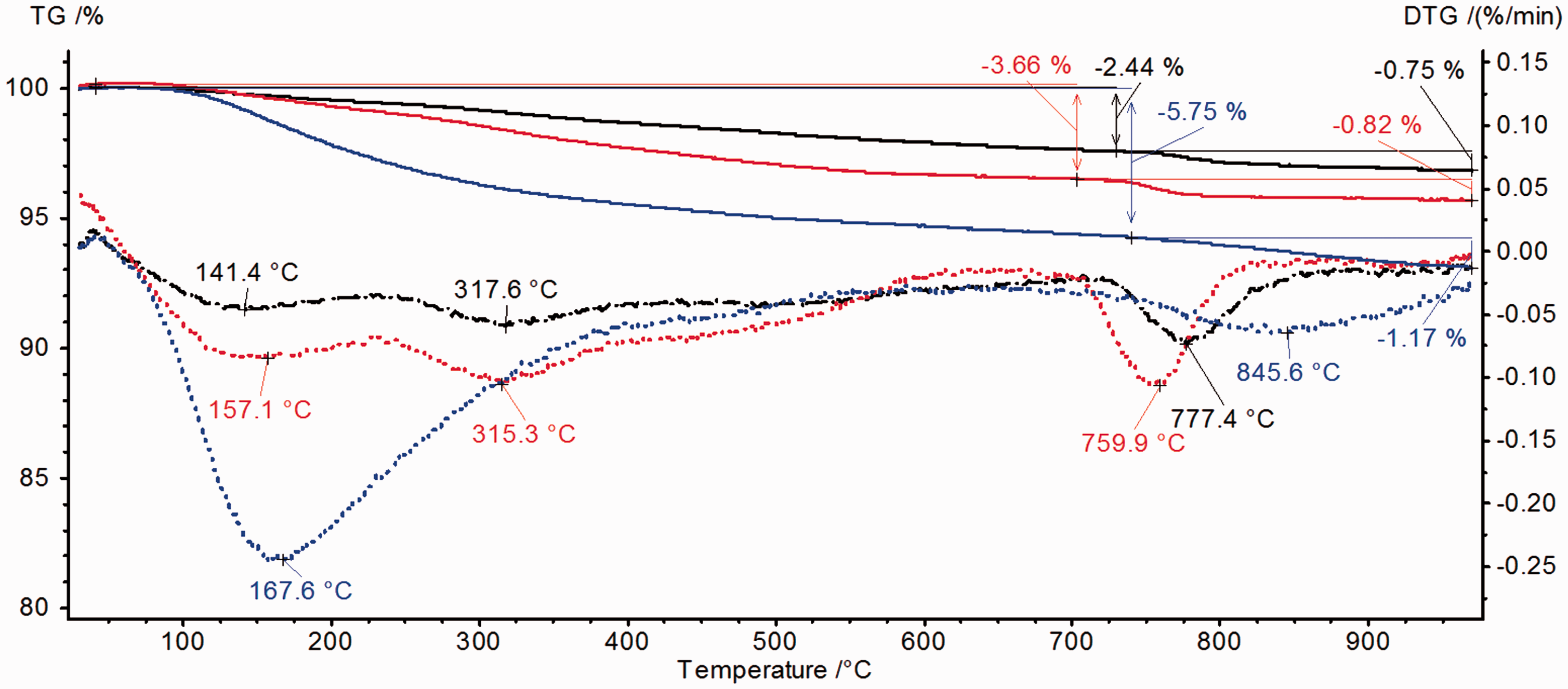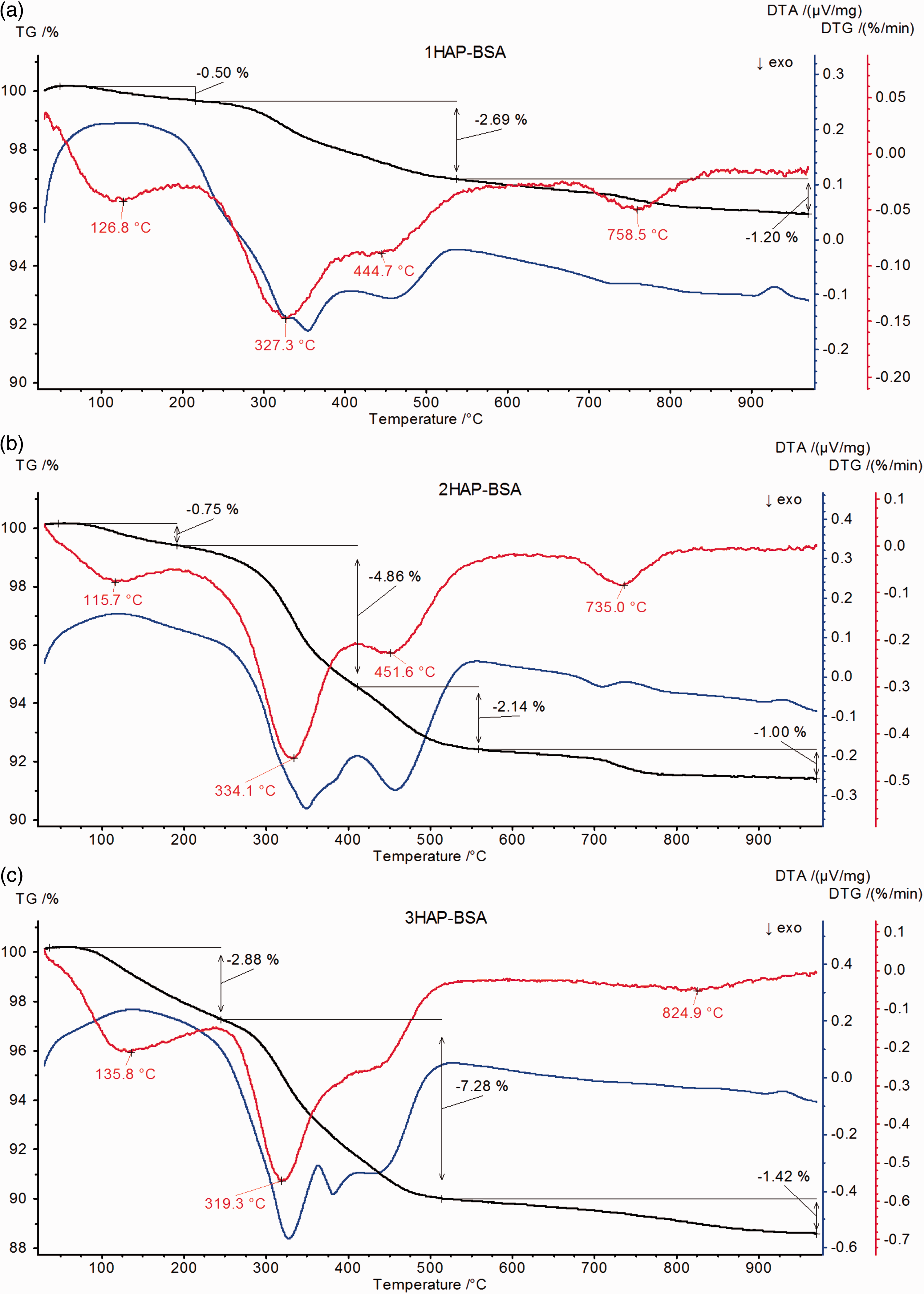 TG (continuous line) and DTG (broken line) curves of hydroxyapatite samples: HAP1 (black colour), HAP2 (red colour) and HAP3 (blue colour). TG (black line), DTG (red line) and DSC (blue line) curves for hydroxyapatite samples modified by BSA.