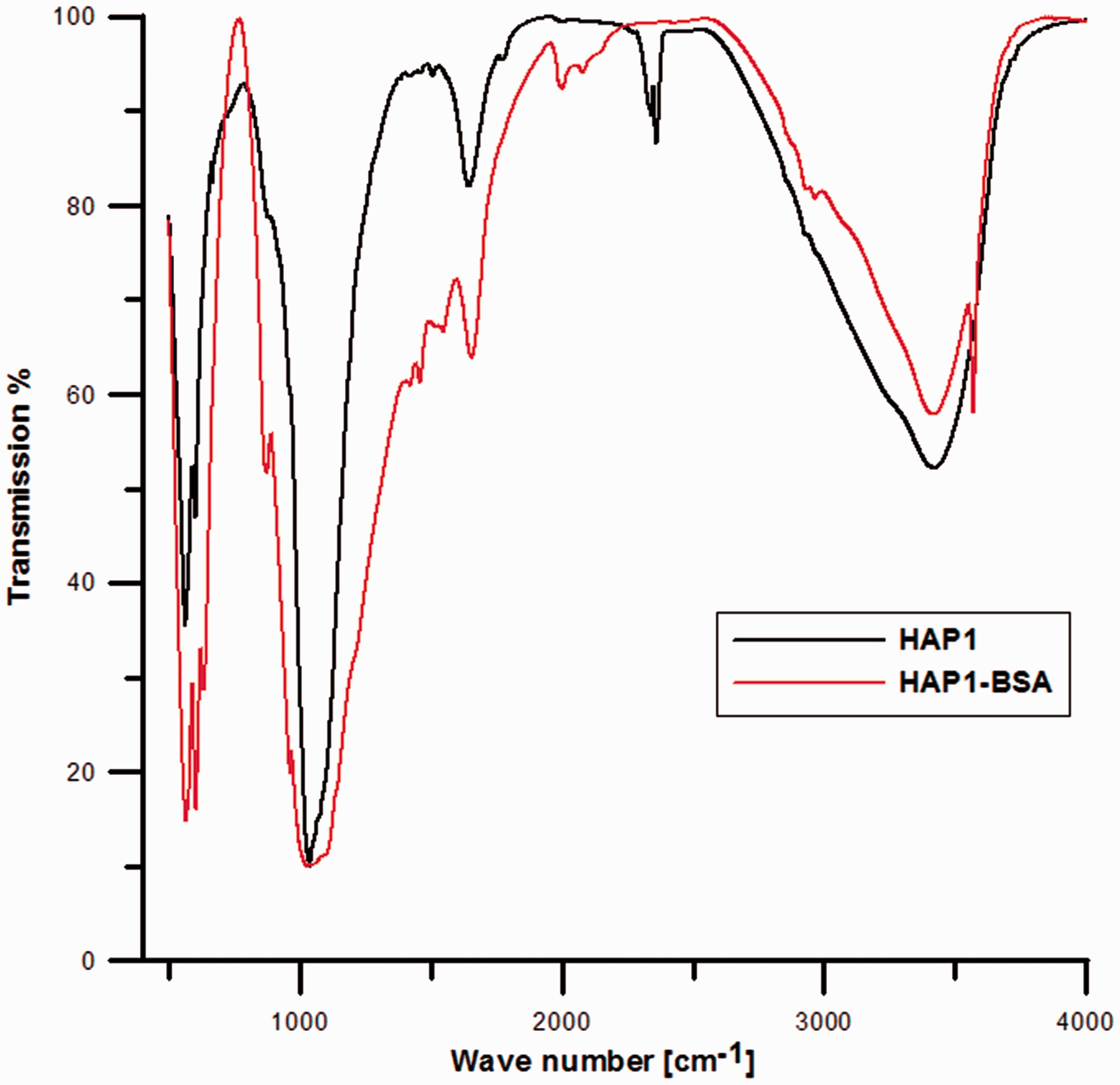 Transmission spectrum of hydroxyapatite and BSA.