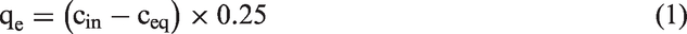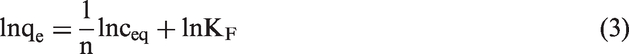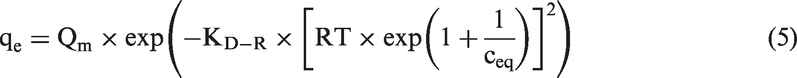 In the equations, qe and ceq denote the equilibrium concentrations of phenol or phosphate(V) in the clay (mol/g) and aqueous phase (mol/dm3); qmax, K, and n stand for adsorption maximum (mol/g), adsorption constants, heterogeneity parameter of the surface, respectively; Qm is the theoretical maximum capacity (mol/g); and bT is the Temkin constant (J/mol). The mean free energy of adsorption E (kJ/mol) from the Dubinin–Radushkevich isotherm was calculated using equation (6)