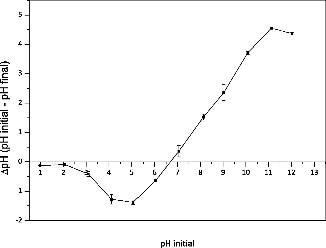 Point of zero charge test (pHpcz) was performed to evaluate the charge on the biosorbent surface. It was determined from samples containing 50 mL of sodium chloride (NaCl) solution (0.01 M), with the pH adjusted from 1 to 12 ± 0.1 and 0.10 g of biosorbent. Samples were maintained for 24 h at 130 rpm and 303.15 ± 2 K. After this period, the final pH was determined, and data were plotted for pHpcz determination.