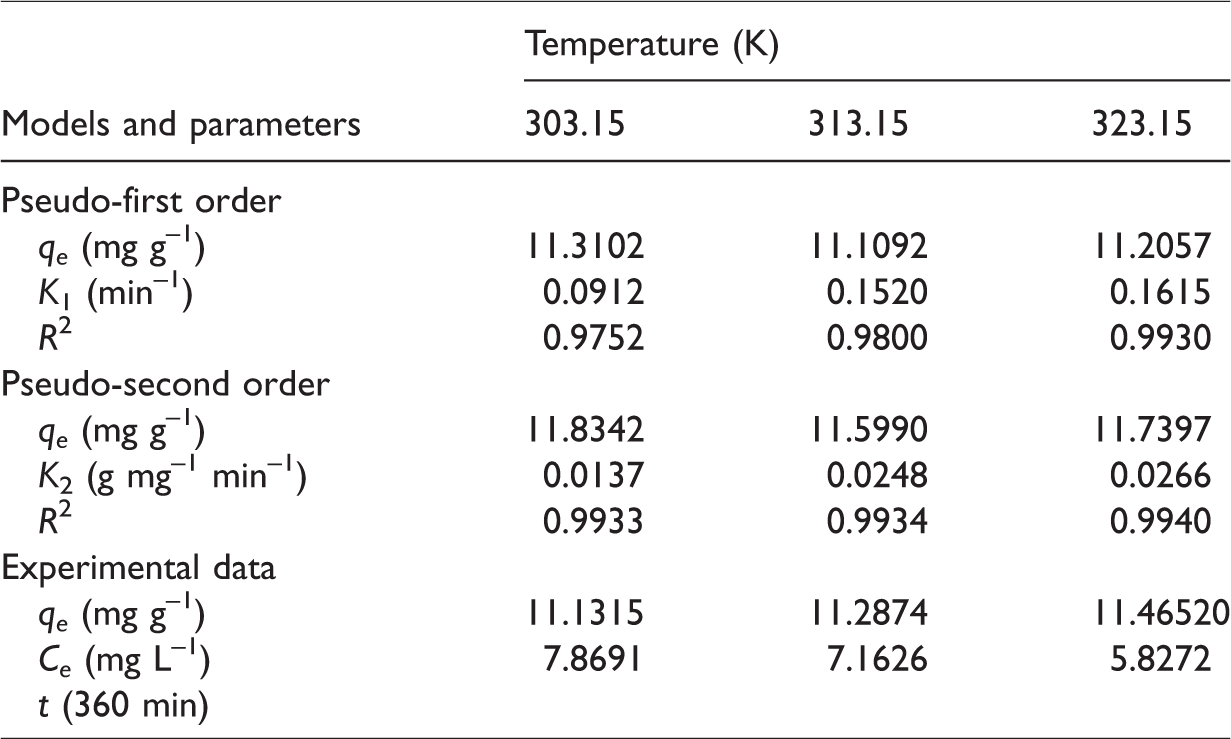 Kinetic models of pseudo-first and pseudo-second order adjusted to the experimental data of removal at different temperatures.