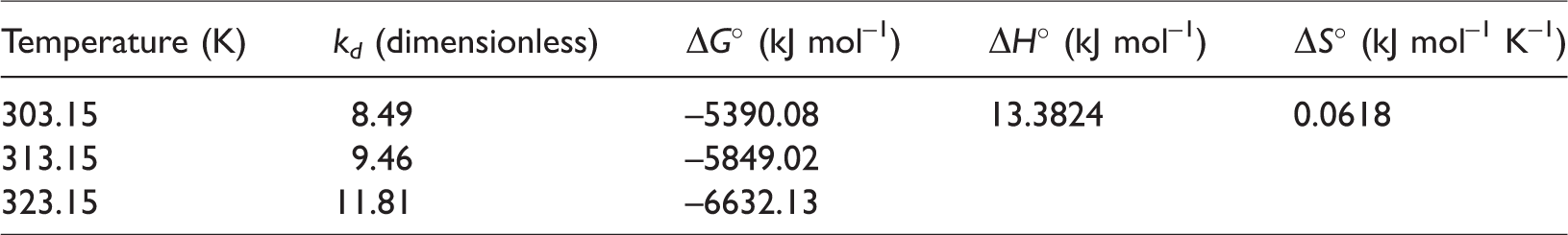 Thermodynamic parameters evaluated at temperatures 303.15, 313.15, and 323.15 ± 2 K for the biosorption of YR-B2R by malt bagasse can be observed in Table 2.