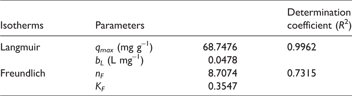 The adjustment of isotherms to the experimental data was performed from the mathematical software Origin 6.0 Demo. Table 3 shows the parameters and determination coefficients obtained. We verified that Langmuir isotherm was the model with the best adjustment, with an