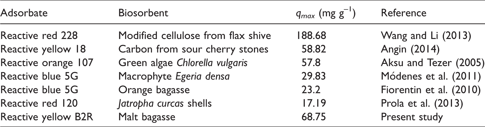 Experimental results of biosorption of YR-B2R dye by malt bagasse (conditions: 50 mL of YR-B2R at 12.5 to 900 mg L–1, 0.30 g biosorbent dose, pH 2 ± 0.1, 360 min contact time at 303.15 ± 2 K and 130 rpm).