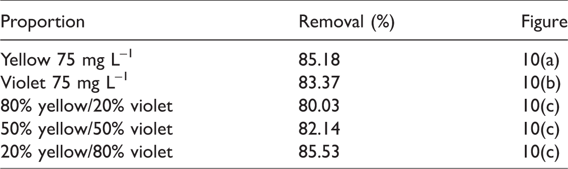 Removal percentage of yellow and violet dyes, separated and combined in different proportions.