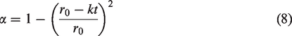 From the results presented in Figure 4, one can recognize that the plots of α2 versus time considerably deviate from the linearity through the whole range of α. The established deviation from the linearity indicates that the kinetics of phenol adsorption cannot be described with the interparticle diffusion model.