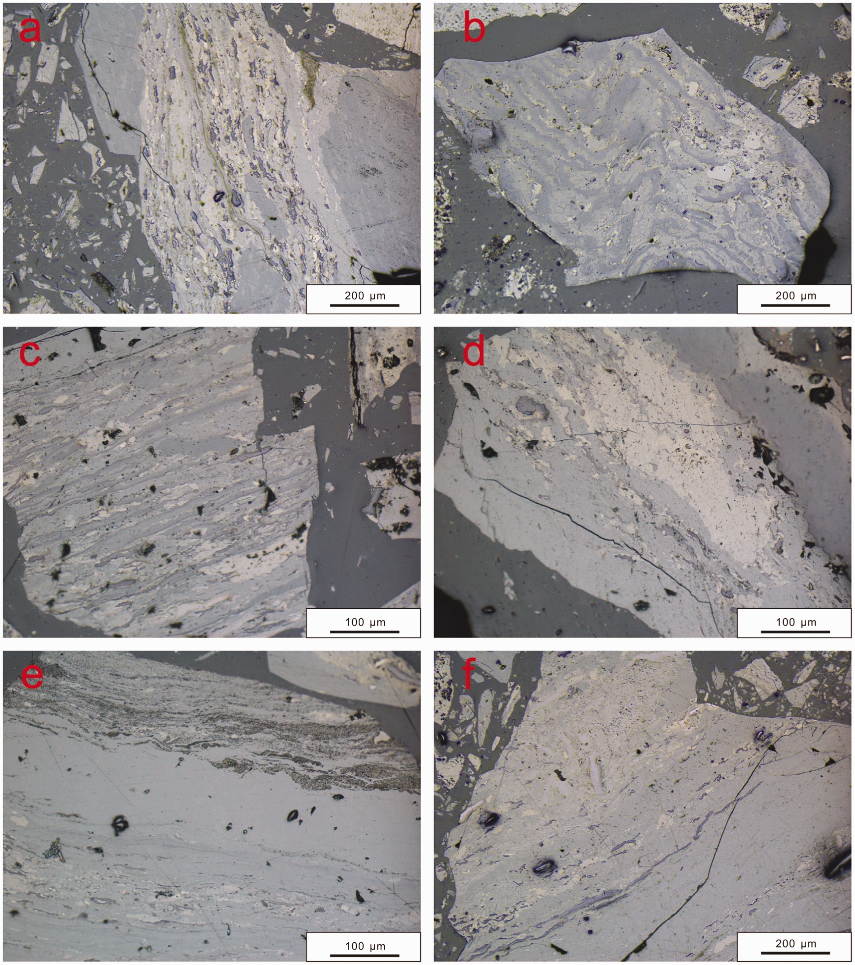 The organic fraction of coal is mainly composed of the maceral groups, vitrinite, inertinite, and liptinite. The main maceral in sample N20 is desmocollinite. The types of inertinite are predominately semifusinite and inertodetrinite. Liptinite is dominitely sporinite. There are also some microcracks in sample N20 (Figure 2(a)). The macerals of sample N24-2 are predominantly telocollinite, telinite, and semifusinite. Vitrinite exhibits microfolding and bending characteristics under deformation, which indicates that the sample is affected by ductile deformation (Figure 2(b)). The macerals in sample N25 are dominantly desmocollinite, semifusinite, and barkinite with few liptinite (Figure 2(c)). There are some microcracks in sample N26-1, which occurs in desmocollinite and semifusinite (Figure 2(d)). The macerals in sample N27 are mostly desmocollinite and inertodetrinite. These are interlaced with clay minerals, which demonstrate bending shapes (Figure 2(e)). The macerals in sample N32 are desmocollinite and semifusinite (Figure 2(f)). Macroscopic characteristics of the coal samples are shown in Figure 3.