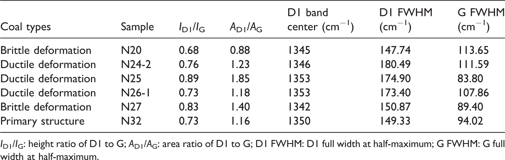 The Raman spectra of coal are commonly divided into first-order and second-order regions. Generally, there are two peaks, a defect peak (D peak) and a graphite peak (G peak) (Pan et al., 2017). G peak can be attributed to the in-plane vibration of carbon atoms in graphene sheets (Li et al., 2019). D1 FWHM means crystallite sizes from D1 full width at half-maximum (Seong and Boehman, 2013). The D1 FWHM parameter of the ductile deformation coal (N24-2, N25, N26-1) is greater than that of the brittle deformation coal (N20, N27), as a result of its high rate of defects in the graphitic structures, even though the differences relative to the G FWHM are not statistically significant. The N24-2 sample has the highest D1 FWHM value and a higher G FWHM value. An increase in ID/IG indicates the growth of basic graphene structural units (BSUs). The correlation between the Raman structural parameter ID1/IG and the Langmuir volume (VL) is evident (Figure 6(a)). This relationship indicates that graphitized coal and its defects can greatly enhance the methane adsorption capacity, as the intensity ratio of the D and G bands (ID/IG) can be used to indicate the crystallite dimension (Seong and Boehman, 2013) (Table 2).