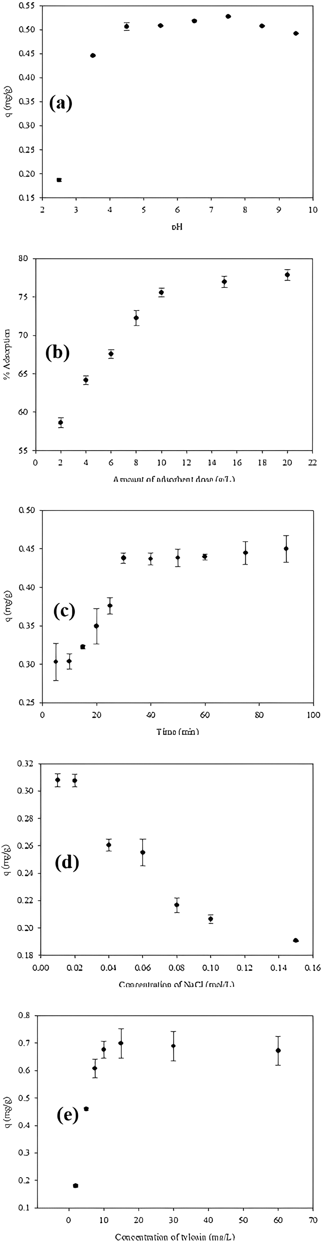 (a) pH effect, (b) adsorbent dose, (c) interaction time, (d) salt effect, (e) adsorbate concentration on adsorption.