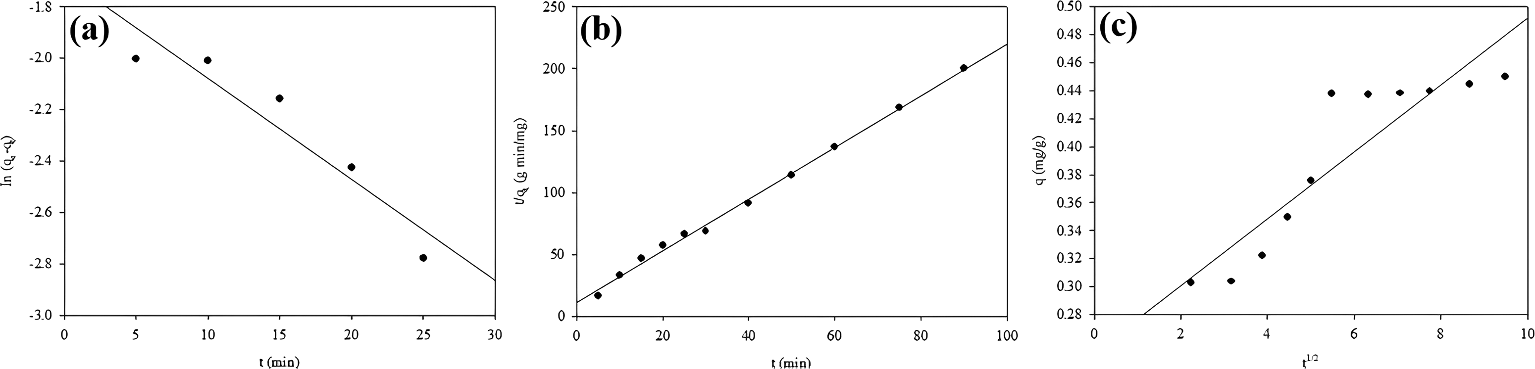 (a) Pseudo-first-order kinetic model, (b) pseudo-second-order kinetic model, (c) intra-particle diffusion model.