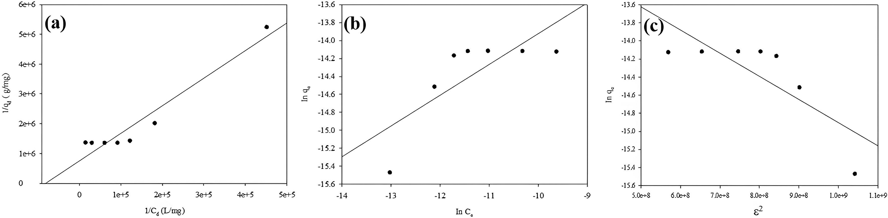 (a) Langmuir isoterm model, (b) Freundlich isoterm model, (c) D–R.