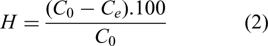 The adsorption capacity (qe, mg/g) and the percentage removal (H, %) were calculated using Equations (1) and (2), respectively, as follow: