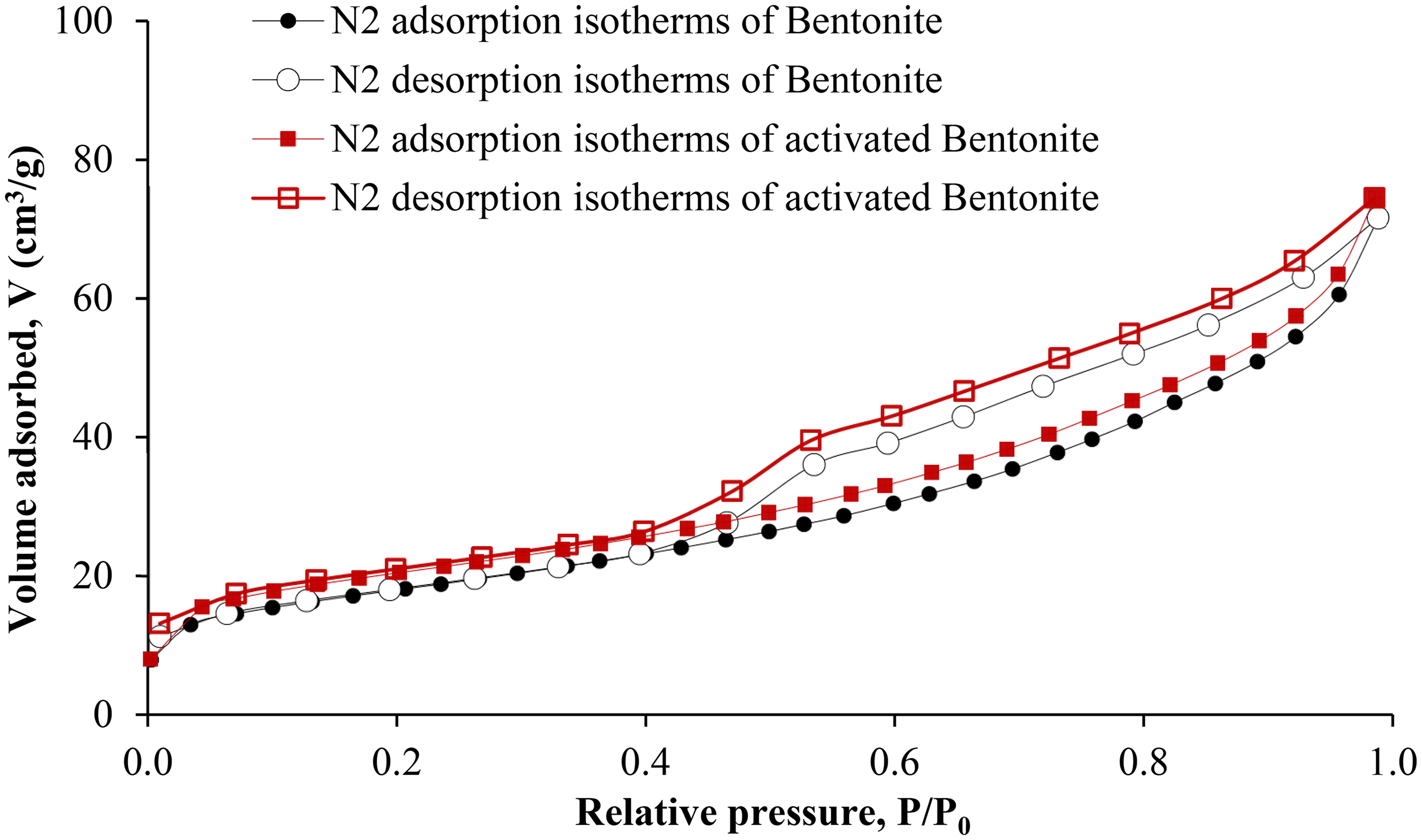 Nitrogen adsorption–desorption isotherms at 77 K of bentonite and HNO3-activated bentonite.