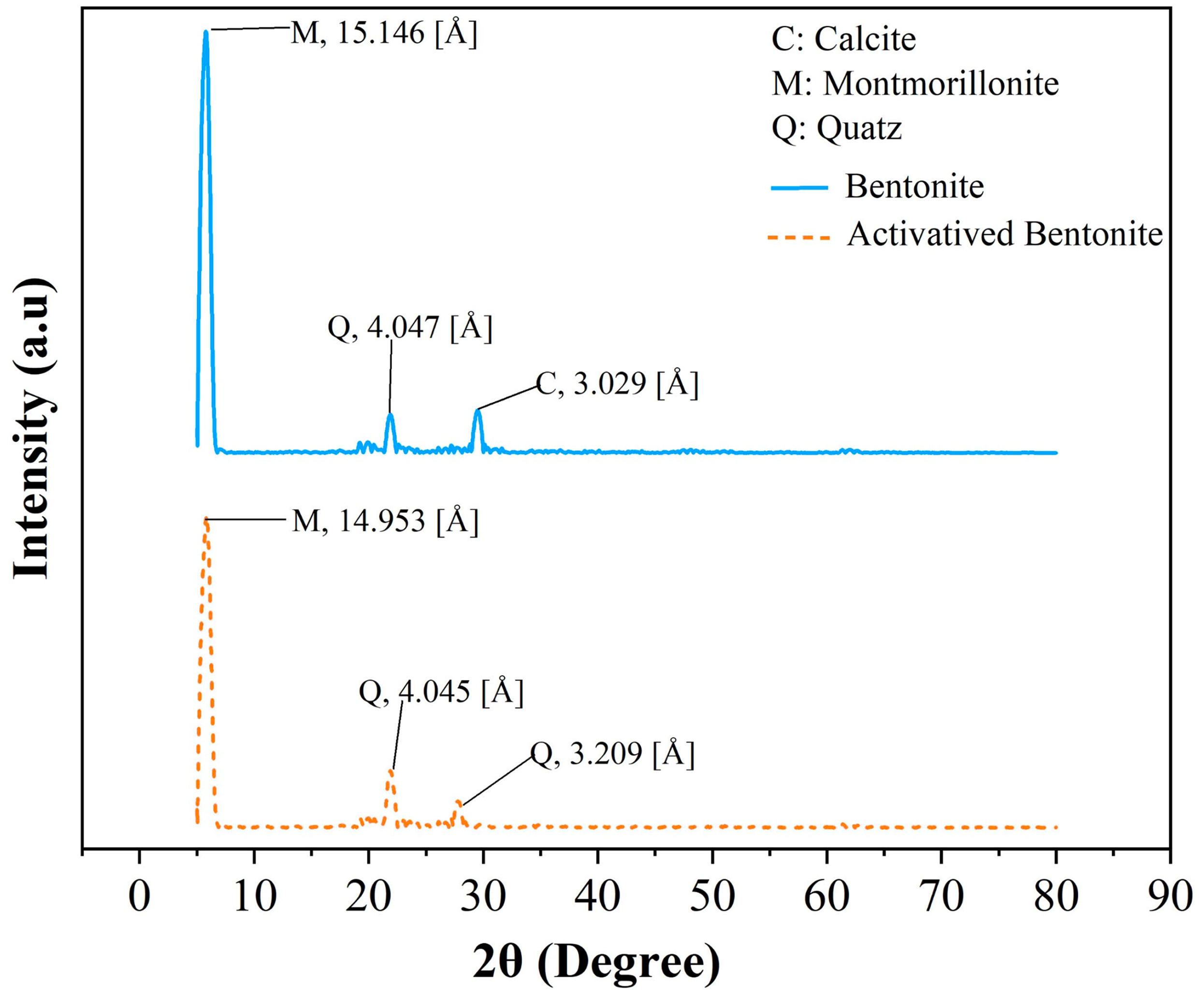 XRD is a key technique for monitoring changes in the interlayer spacing of clay minerals. Figure 2 illustrates the XRD patterns of both bentonite and HNO3-activated bentonite samples.