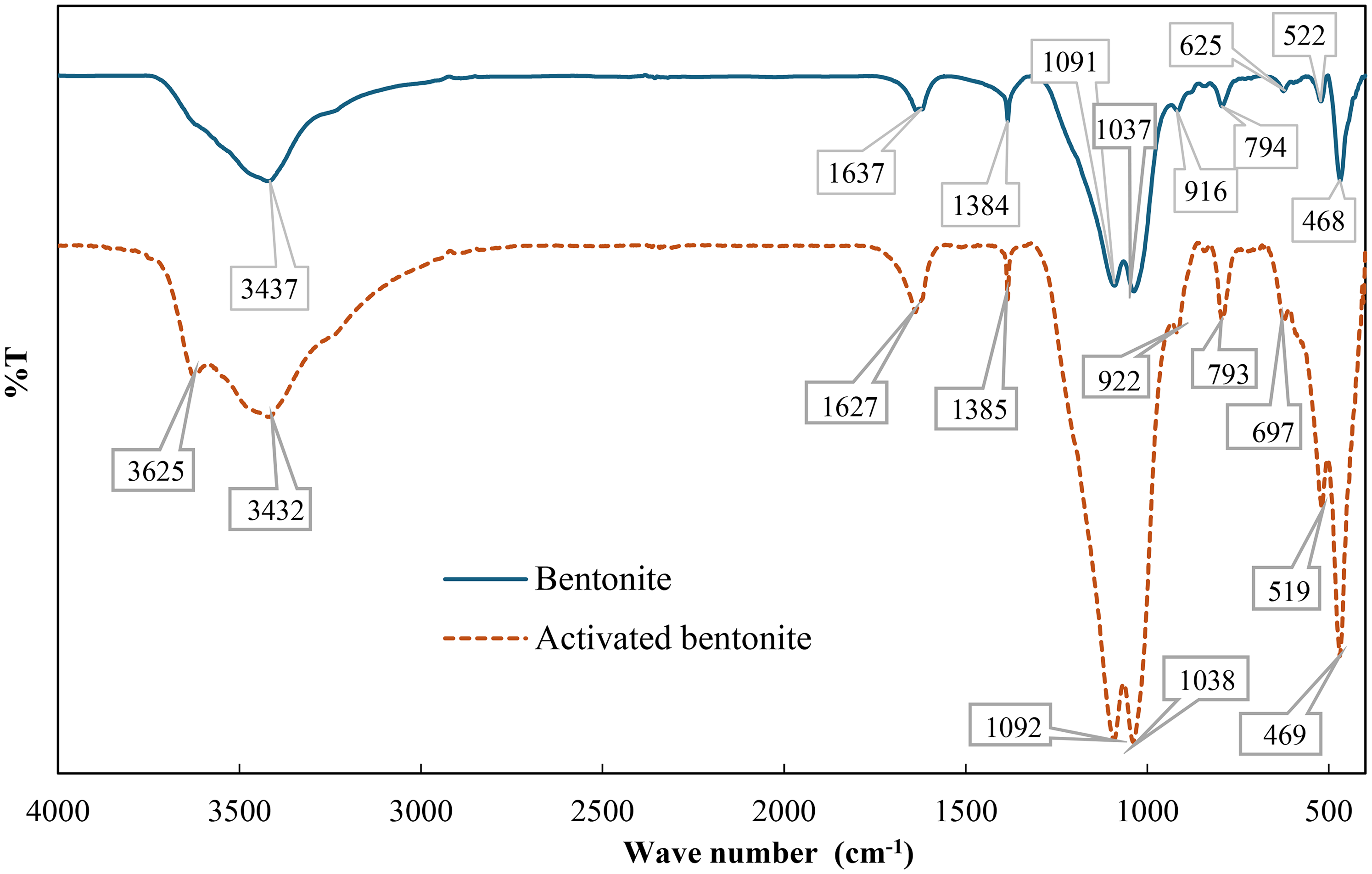 The infrared spectra of bentonite and HNO3-activated bentonite.