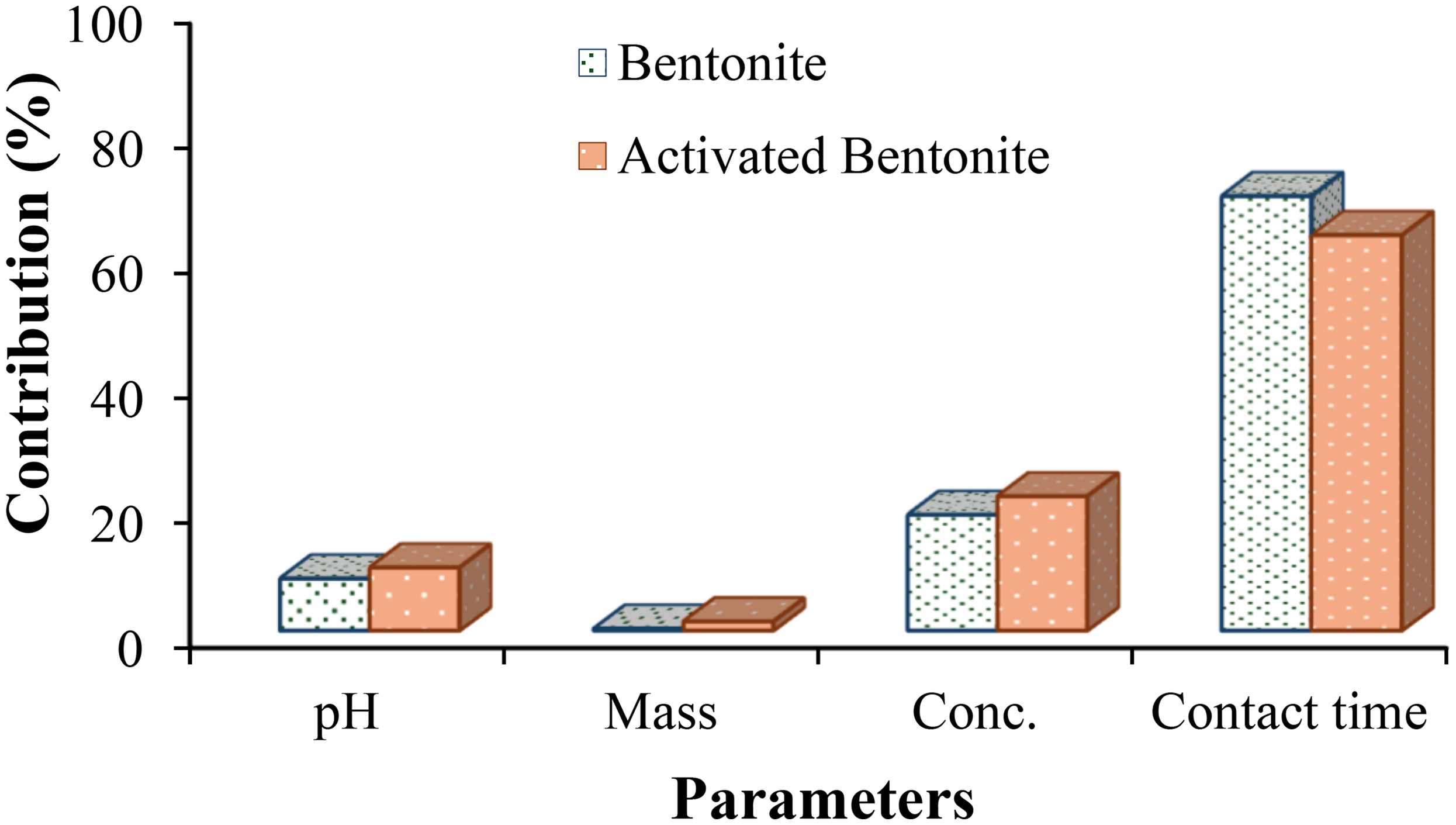 Percentage contribution of parameters to Pb2+ adsorption capacity by bentonite and HNO3-activated bentonite.