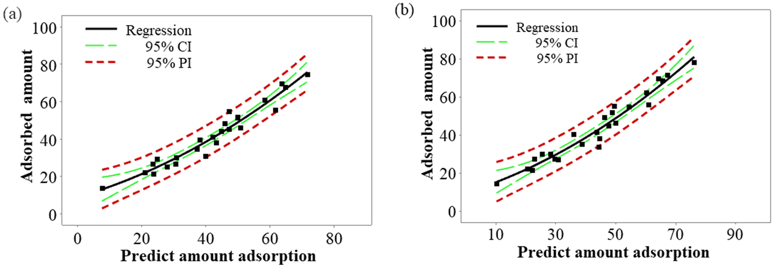 Quadratic regression curve model of bentonite (a) and HNO3-activated bentonite (b).