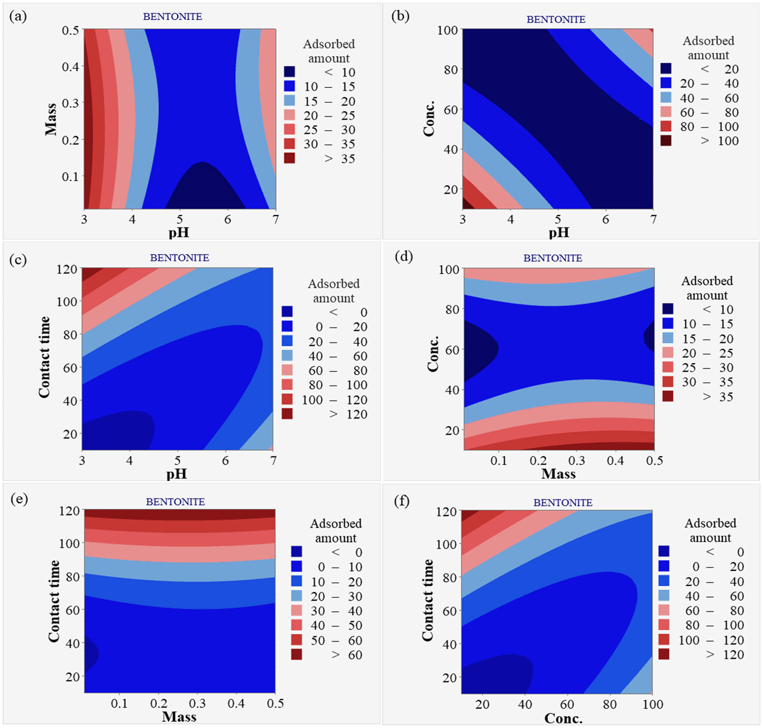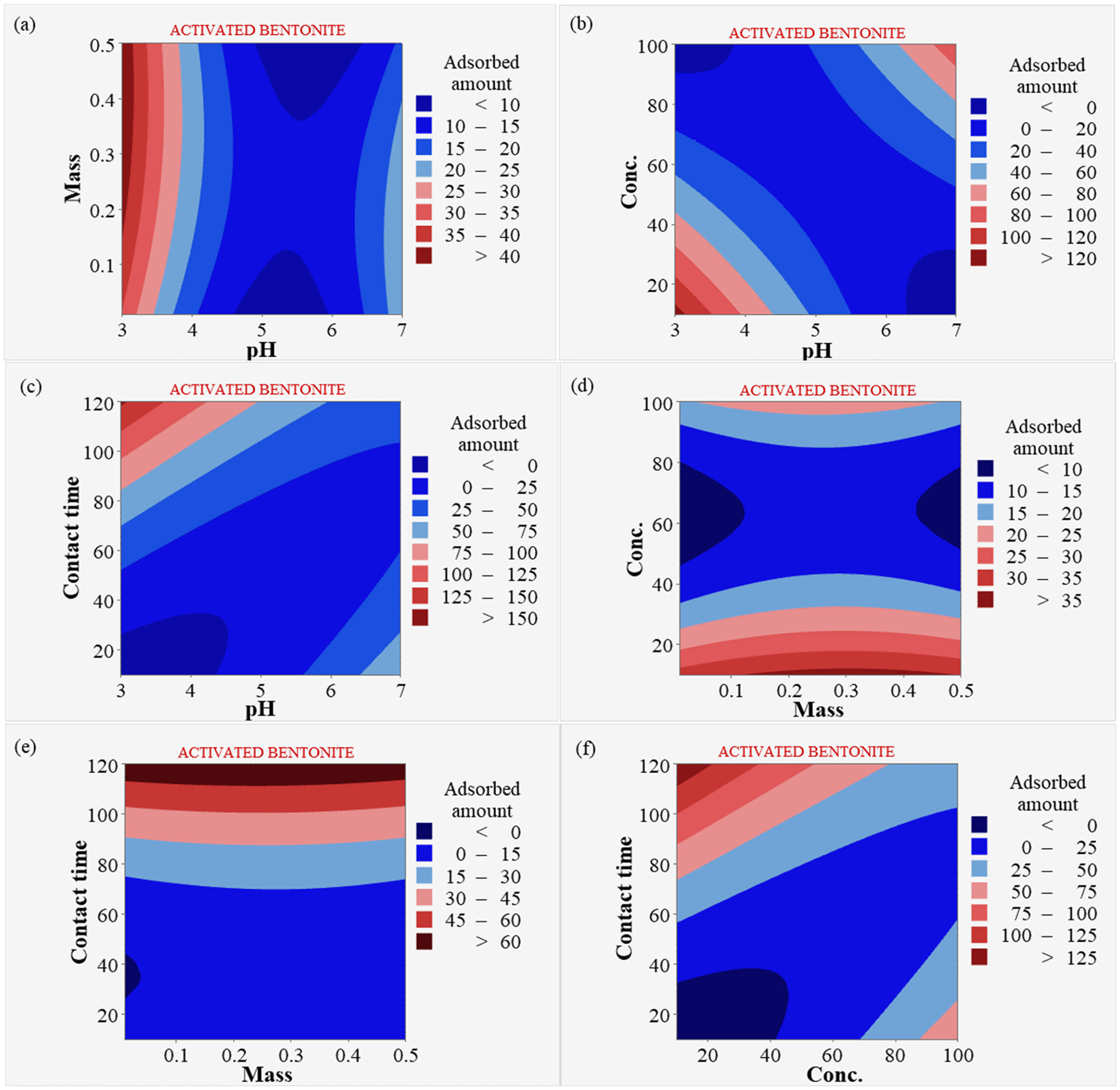Contour plot for bentonite and HNO3-activated bentonite (a) pH and dosage, (b) pH and concentration, (c) pH and contact time, (d) dosage and concentration, (e) dosage and contact time, (f) concentration and contact time.