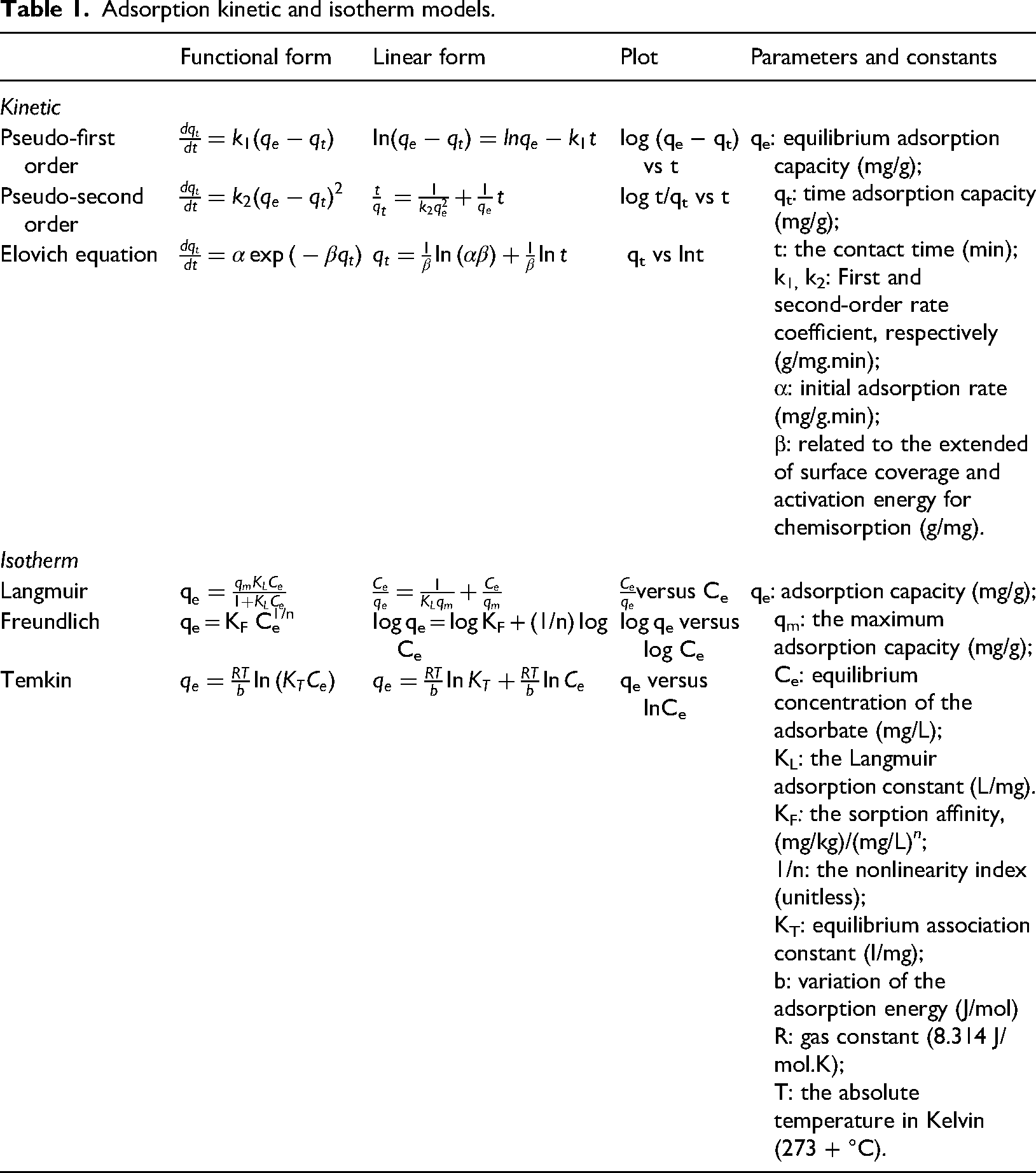 Adsorption kinetic and isotherm models.