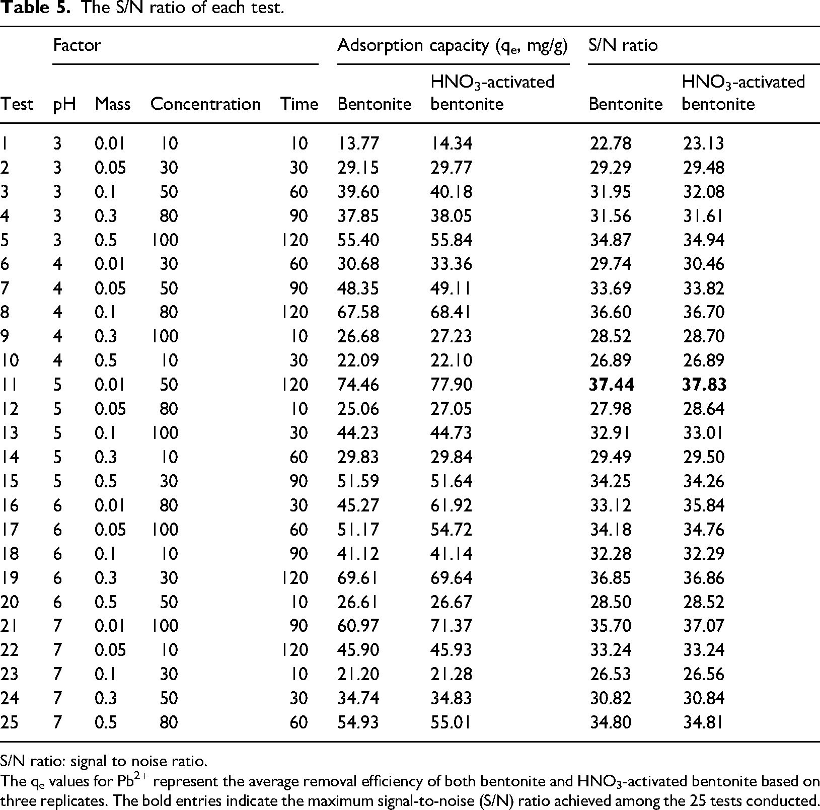 The qe values for Pb2+ represent the average removal efficiency of both bentonite and HNO3-activated bentonite based on three replicates. The bold entries indicate the maximum signal-to-noise (S/N) ratio achieved among the 25 tests conducted.