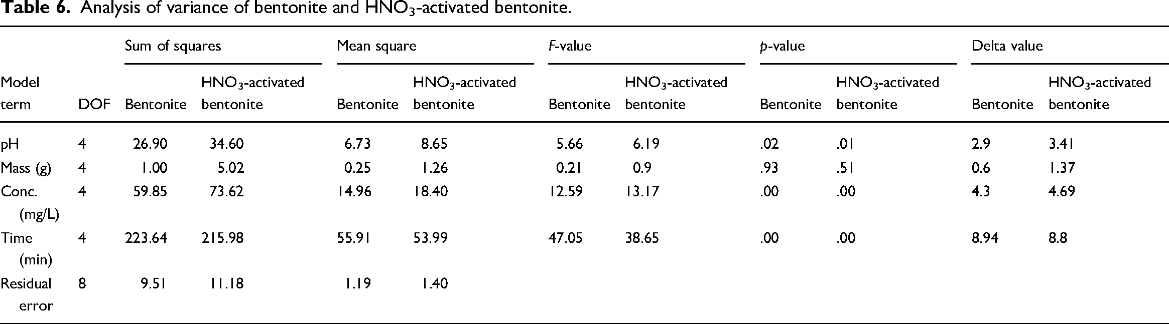 Analysis of variance of bentonite and HNO3-activated bentonite.