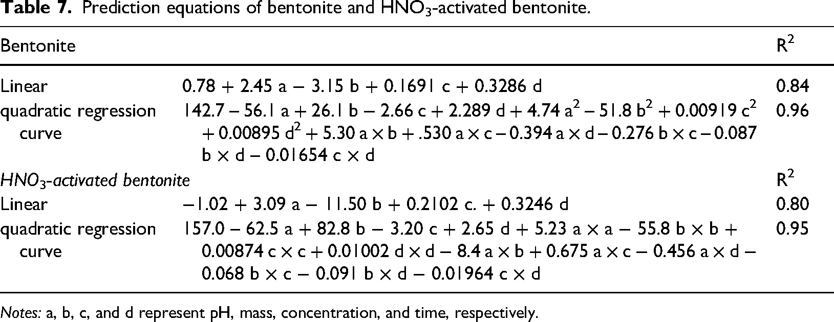Prediction equations of bentonite and HNO3-activated bentonite.