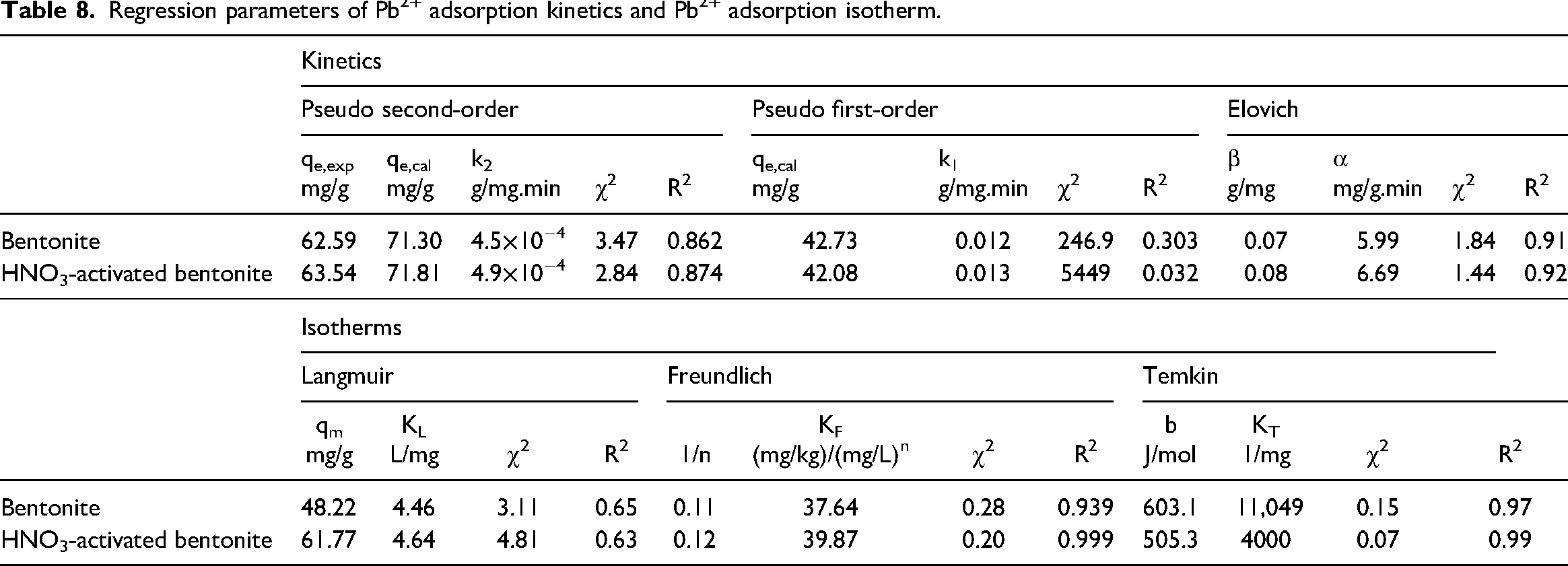 To understand the mechanisms governing the adsorption of Pb2⁺ by bentonite and HNO3-activated bentonite, the kinetic data were analyzed using three models: Pseudo second-order, Pseudo first-order, and Elovich. Additionally, the isotherm data were evaluated using the Langmuir, Freundlich, and Temkin models. The equations for these kinetic and isotherm models are presented in Table 1, while their respective linear parameters are detailed in Table 8.