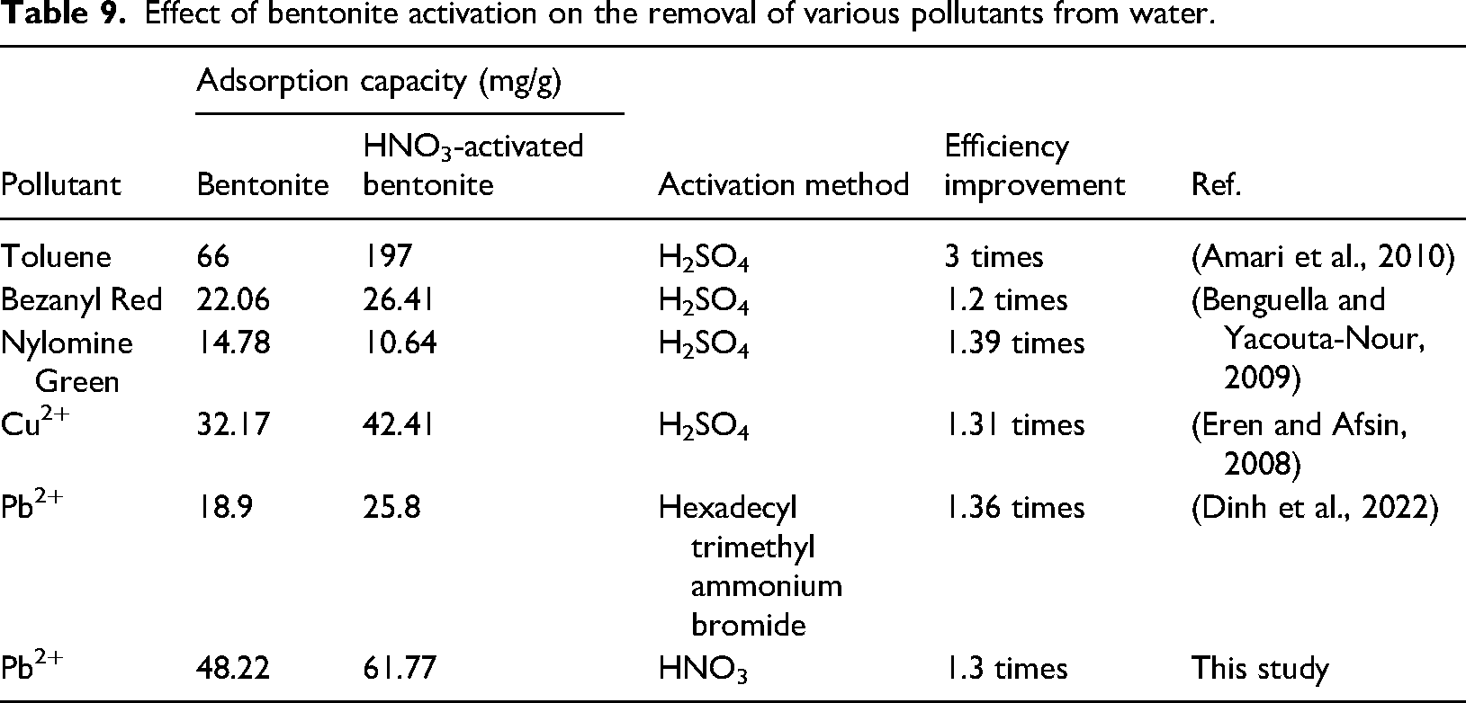 Acid activation of bentonite has been shown in several studies to significantly enhance its capacity to adsorb various pollutants. Research focused on H2SO4 activation for the adsorption of toluene, Cu2⁺, and Pb2⁺ (Amari et al., 2010; Dinh et al., 2022; Eren and Afsin, 2008) indicates that these treatments can markedly improve adsorption performance, as summarized in Table 9. In the current study, the adsorption capacity for Pb2⁺ using HNO3-activated bentonite is reported at 61.77