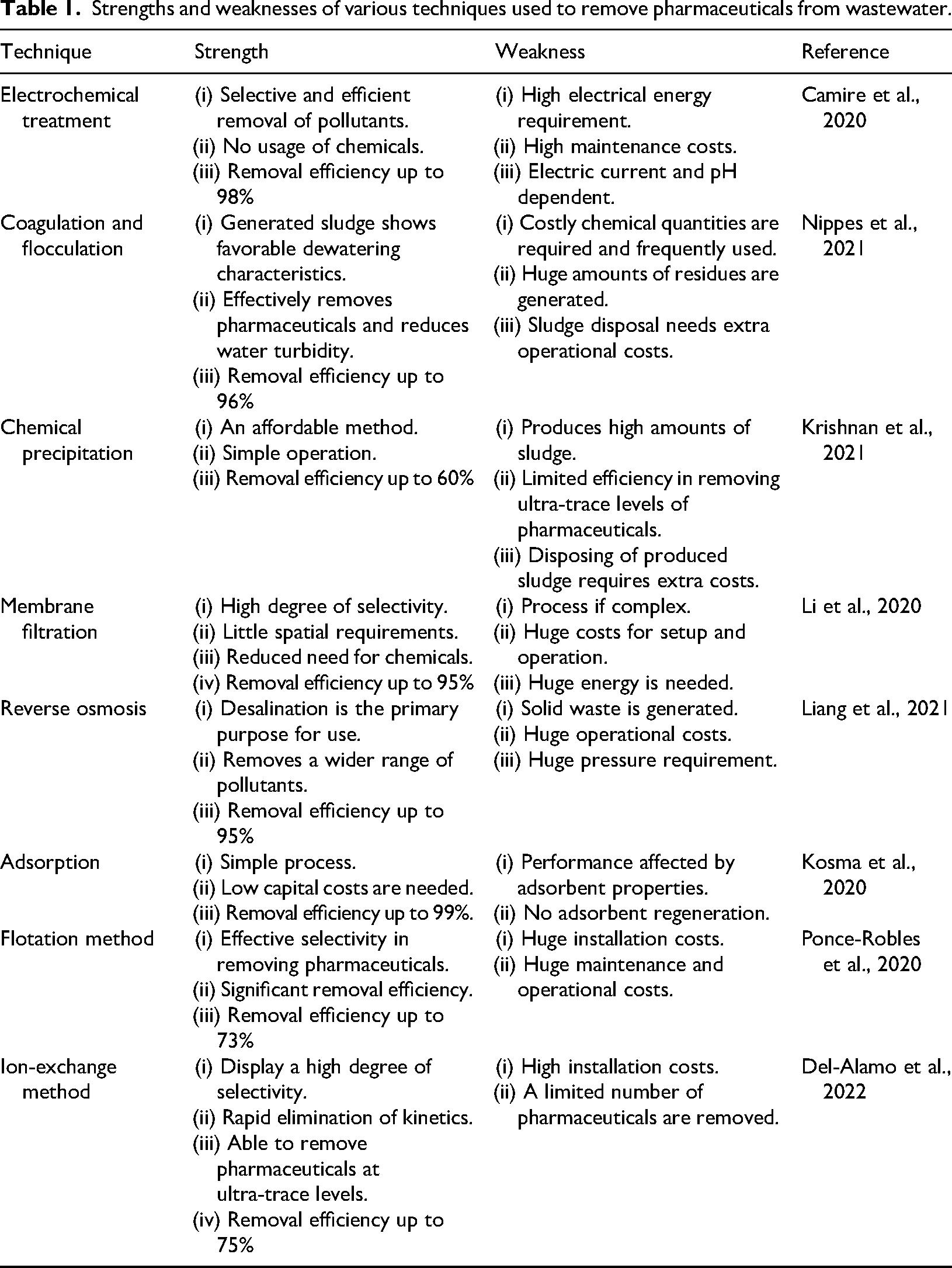 Strengths and weaknesses of various techniques used to remove pharmaceuticals from wastewater.