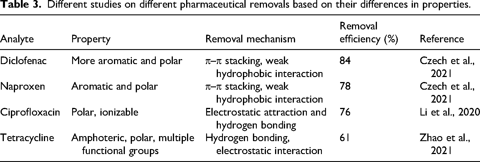 Different studies on different pharmaceutical removals based on their differences in properties.