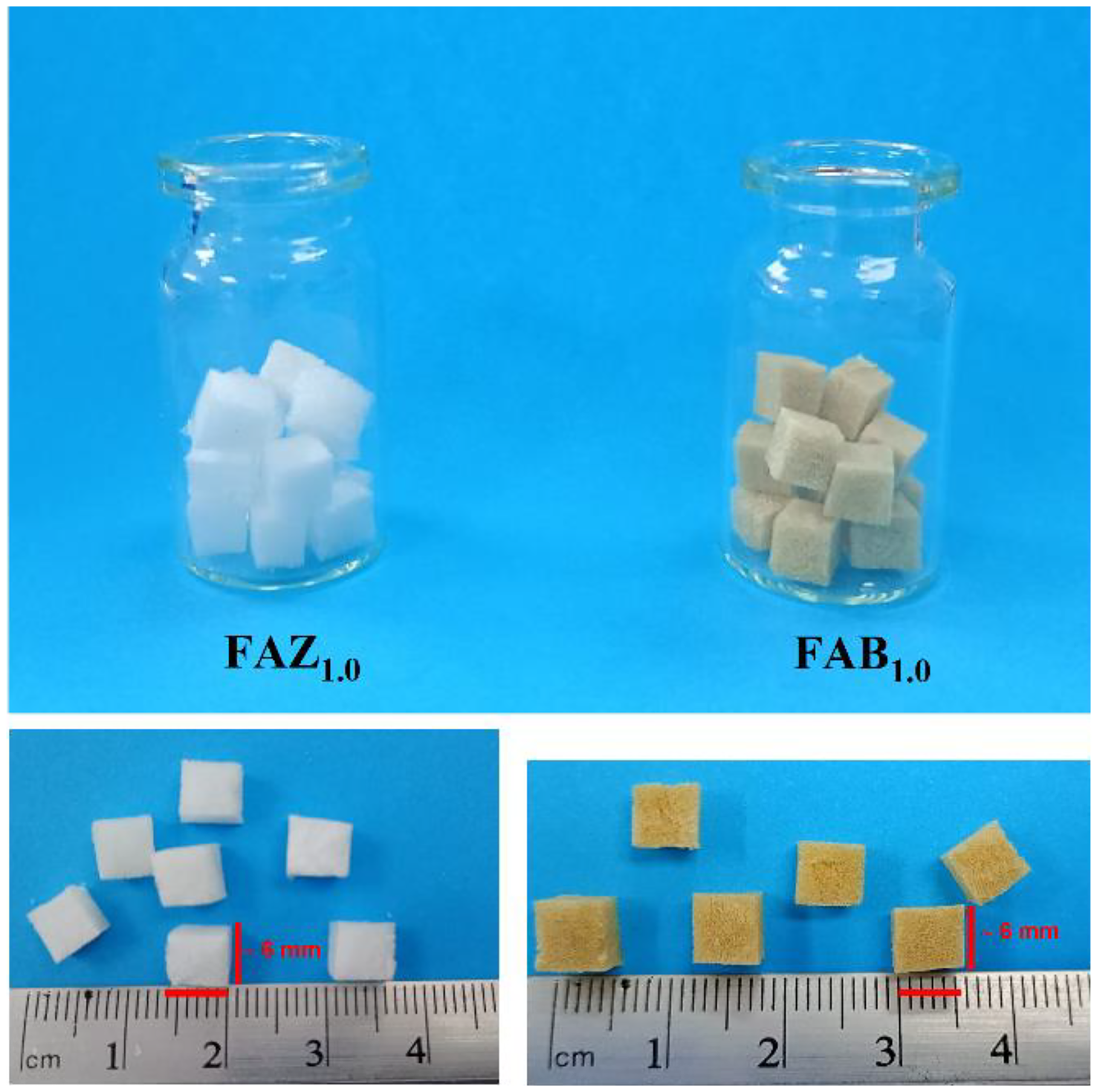 After completing the previous steps, the composites were subjected to a crosslinking process in 100 mL of a 0.5 mol L−1 CaCl2·2H2O solution for 4 h at room temperature, aiming to achieve complete gelation. Afterwards, the composites were rinsed with deionized water to remove any residual calcium ions. The composites were subsequently frozen again at −41 °C for 24 h and lyophilized to obtain a porous sponge-like structure. The materials were cut into small cubes with dimensions of 6 mm × 6 mm (Figure 1) and stored in a desiccator until characterization and subsequent use in experimental procedures. Composites formulated with bentonite were designated as FAB, whereas those prepared with